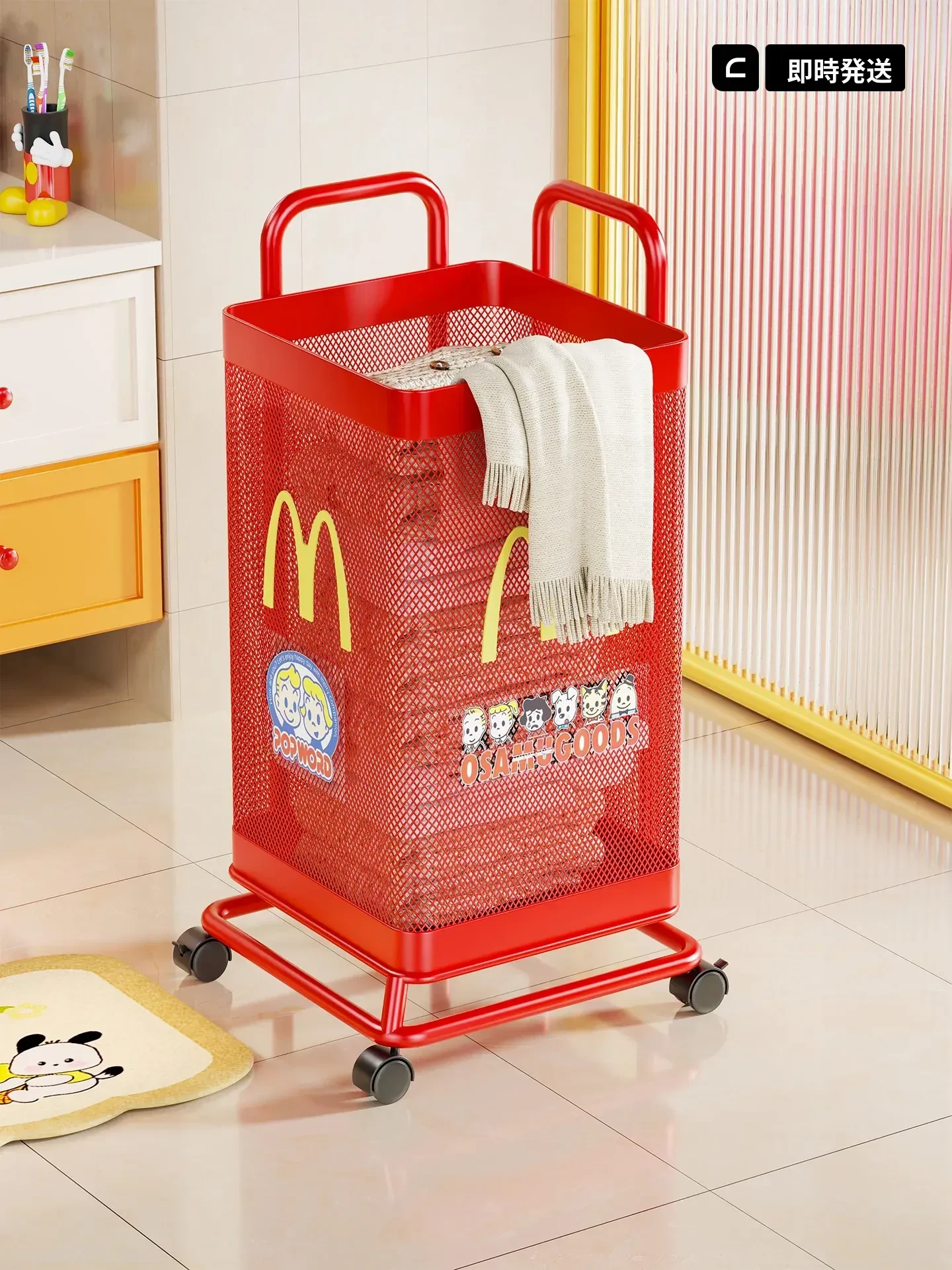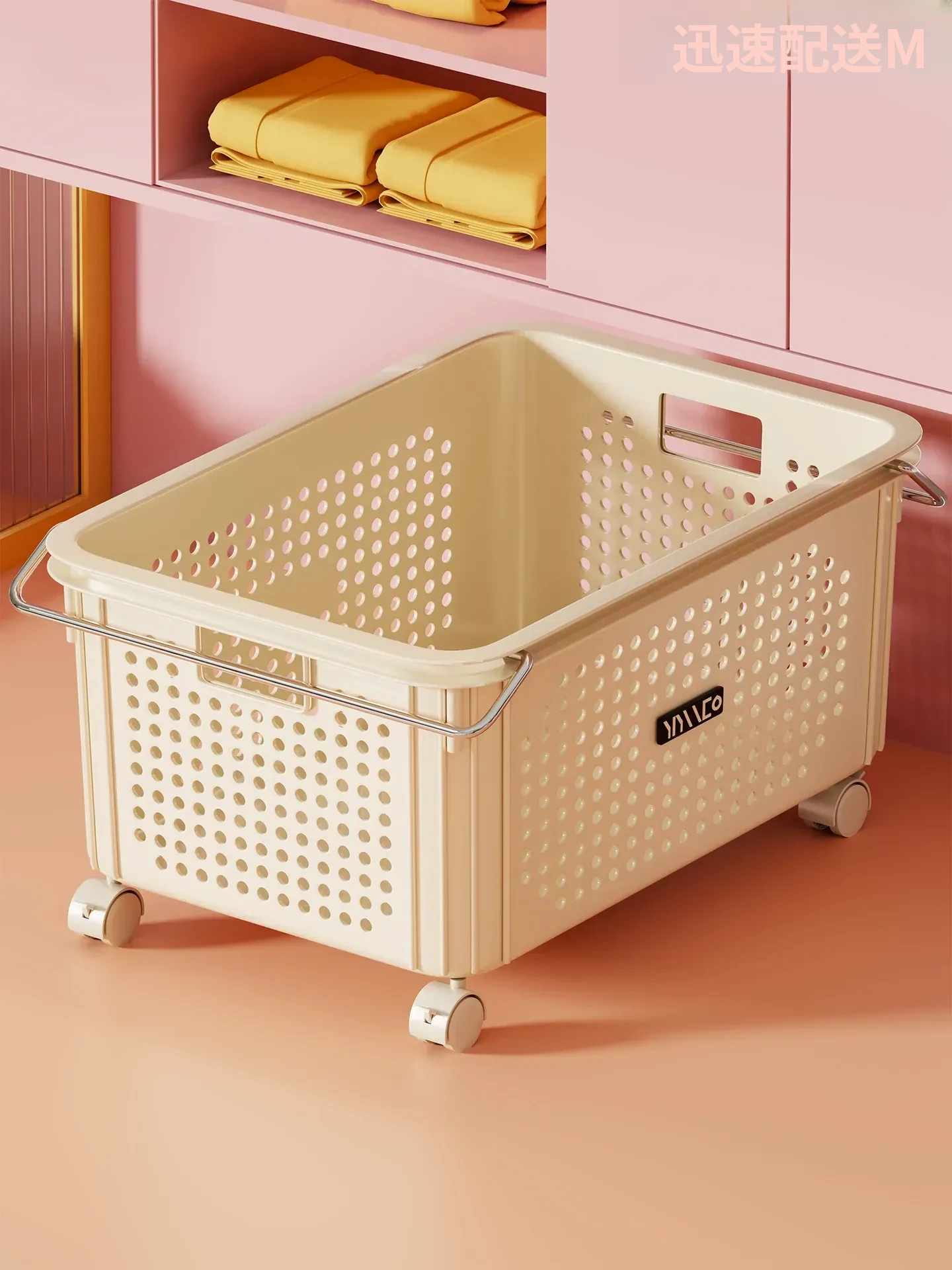 大容量・移動式の家庭用洗濯カゴ!キャスター付きで便利!バスルームやトイレでの使用に最適な清潔感あふれるデザイン。すっきりとしたお部屋作りにぴったりの洗濯物収納バスケット!