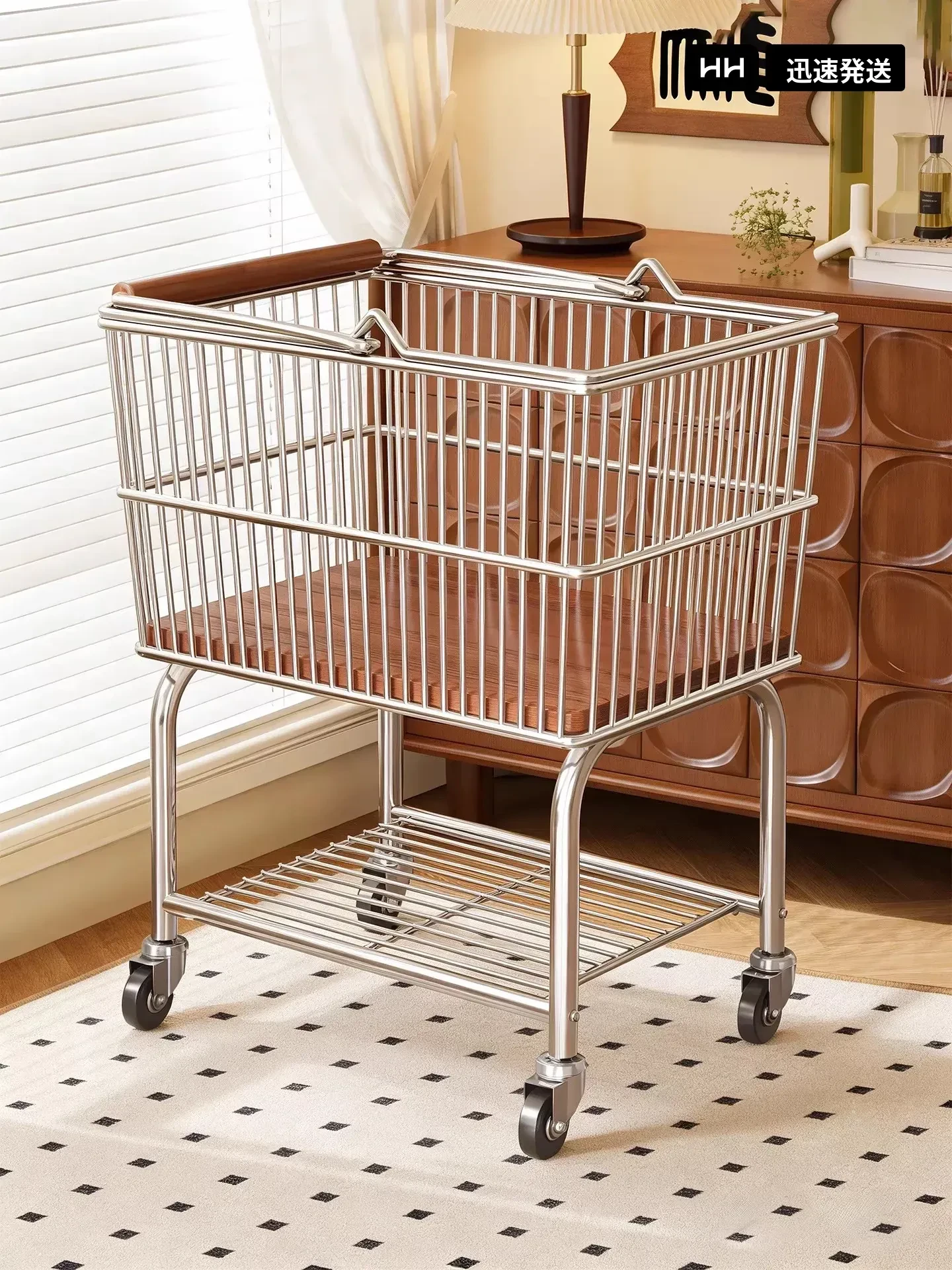 キャスター付き二段式衣類収納バスケット - 家庭用、寝室やバスルームに最適!簡単に移動できるおしゃれなデザインで、洗濯物をスッキリ片付けられます。清潔感と便利さを兼ね備えた必須アイテム!