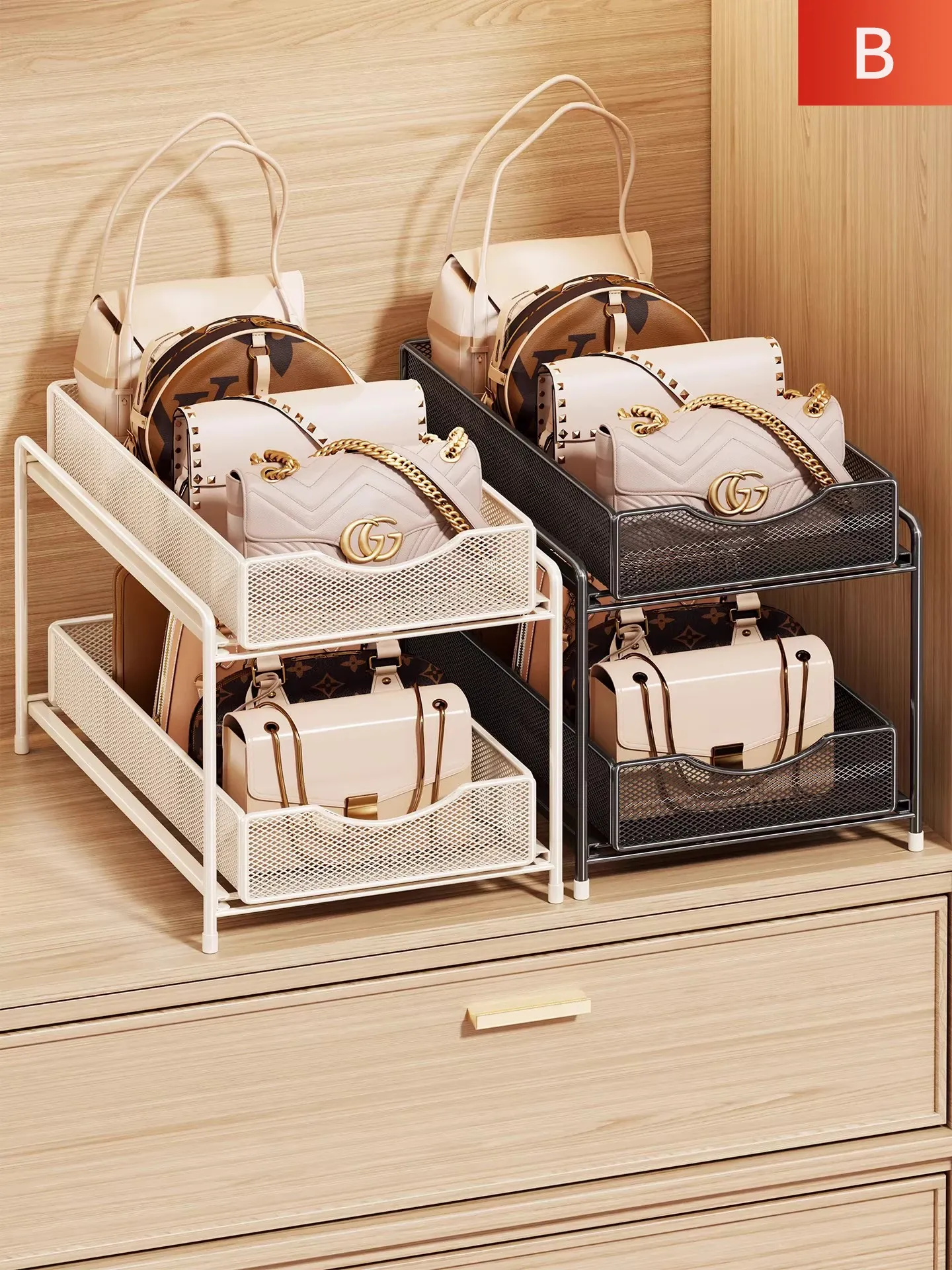 収納力抜群!バッグ収納ラック - 衣類やバッグを整理整頓できる多層仕切り付き!クローゼット内での皮製品や下着の収納に最適なハンガーラックです。あなたの衣類スペースをすっきりさせましょう!