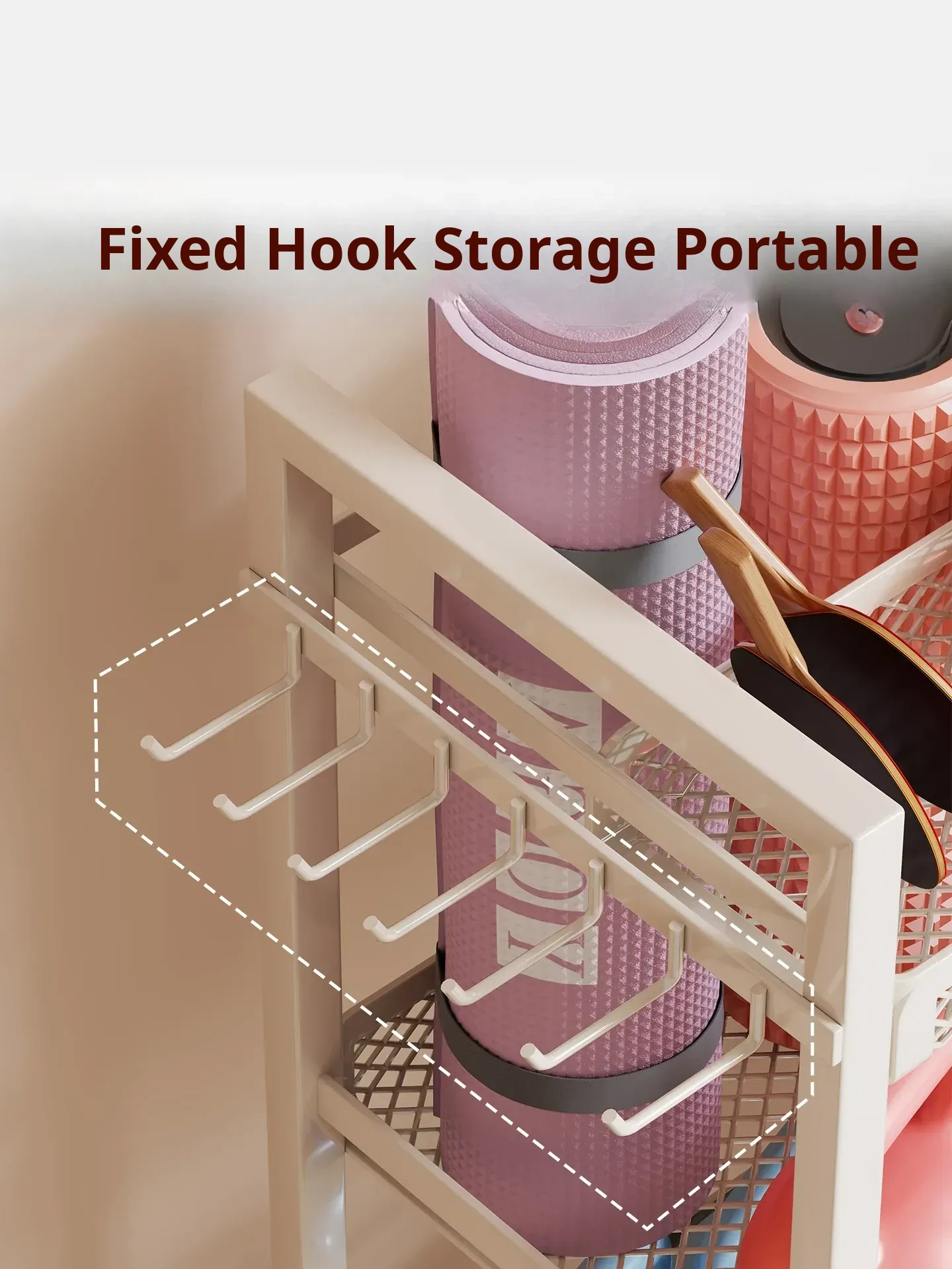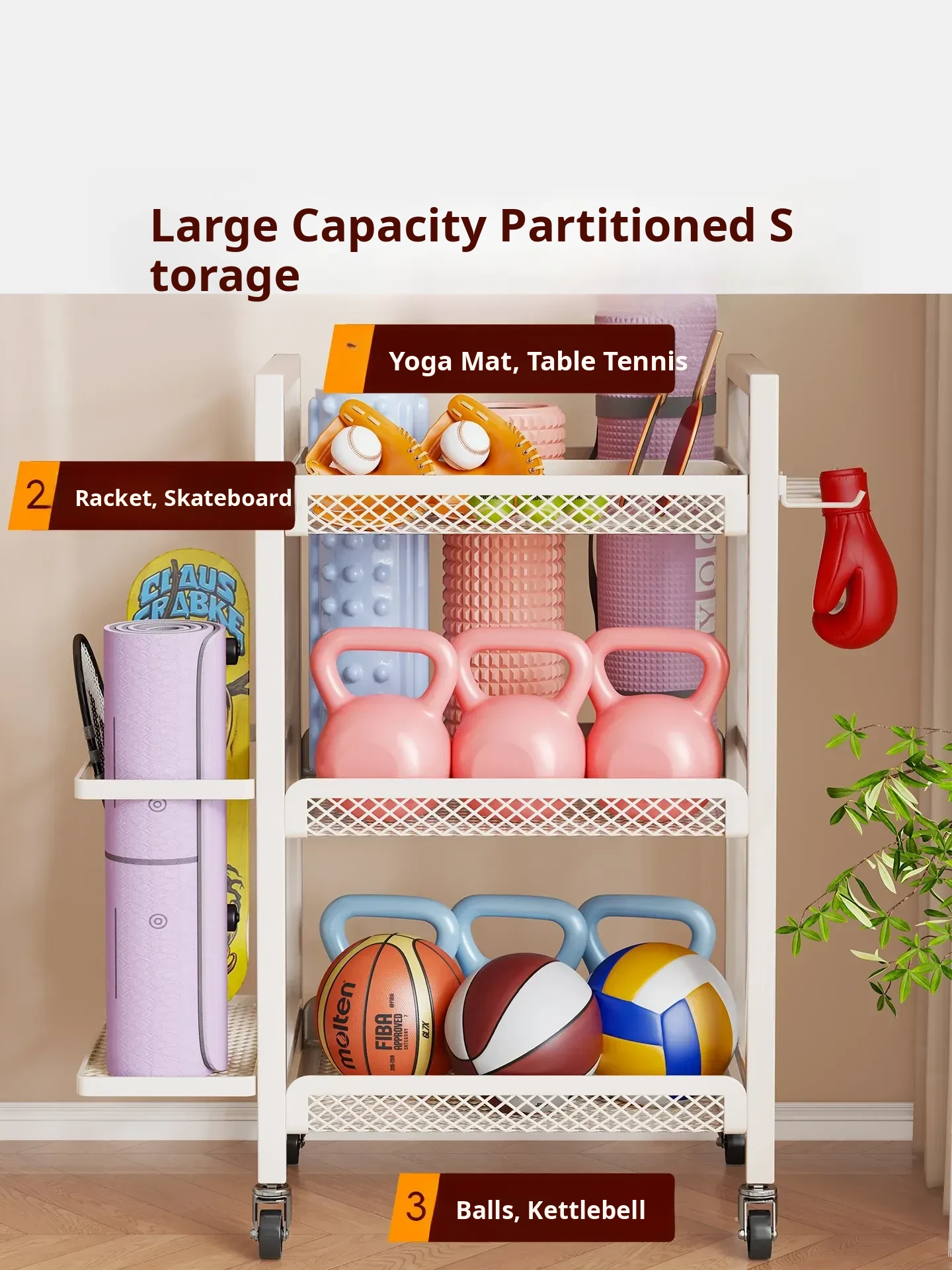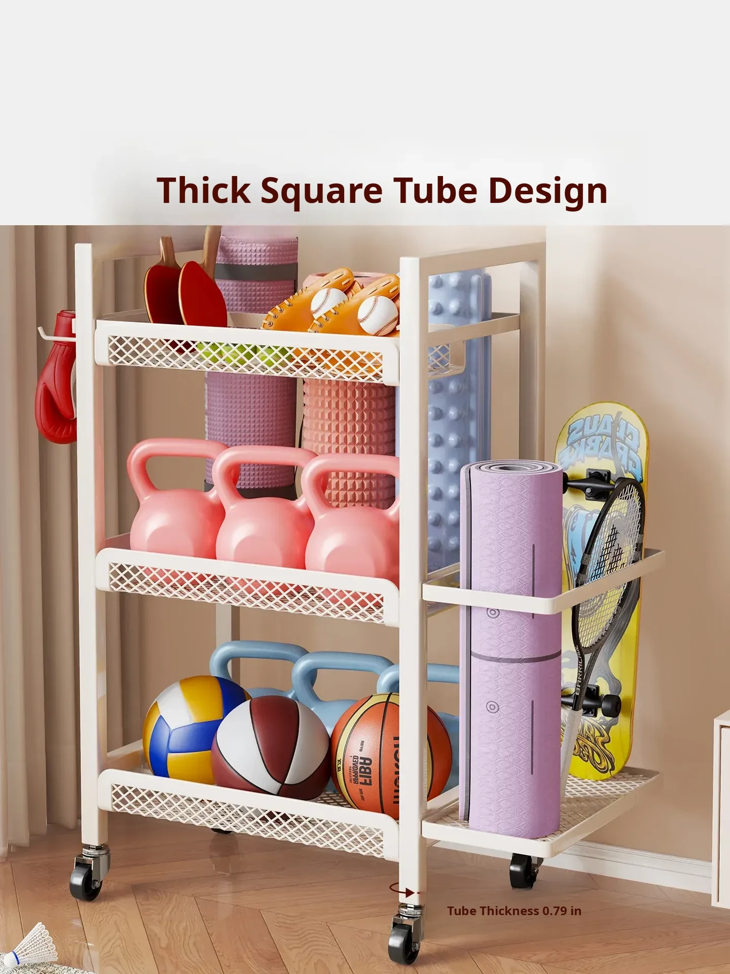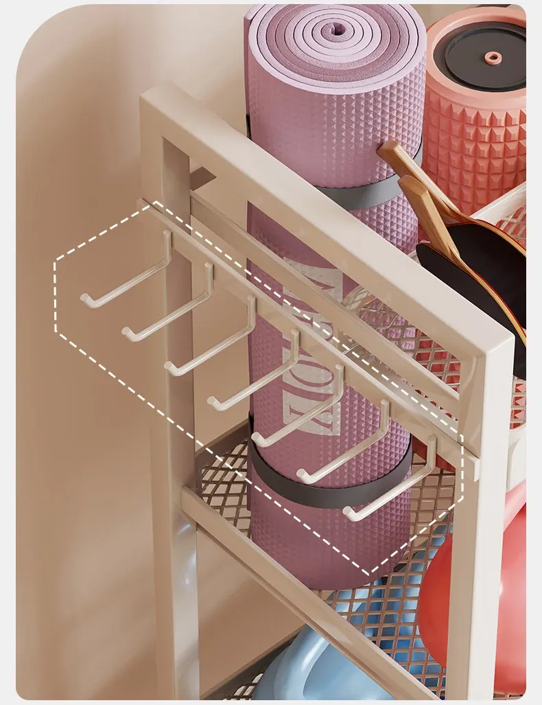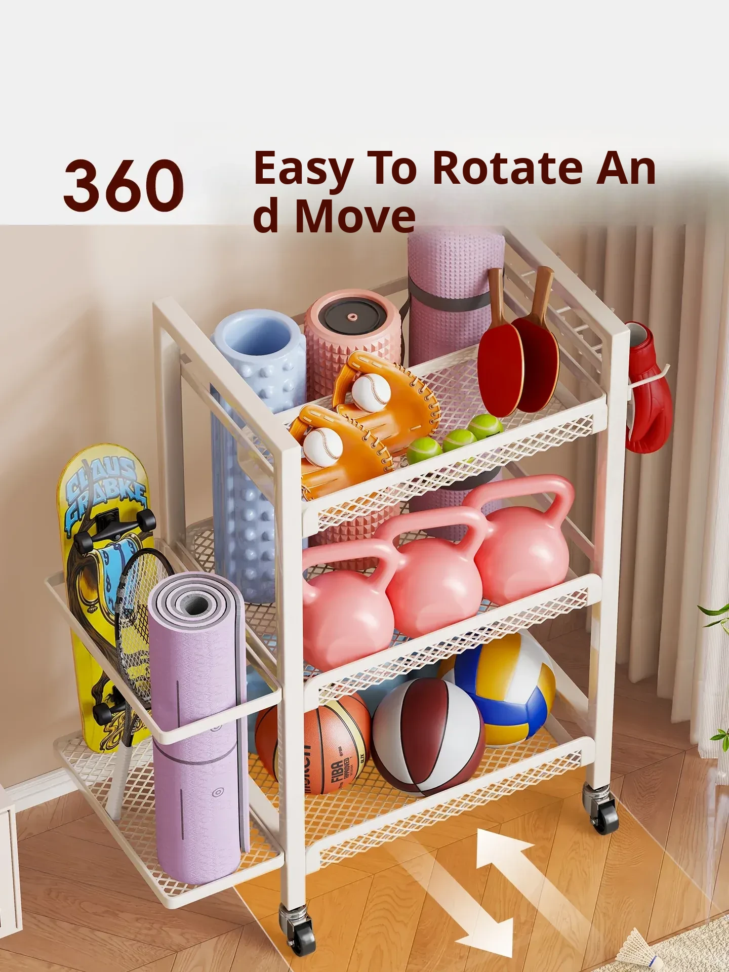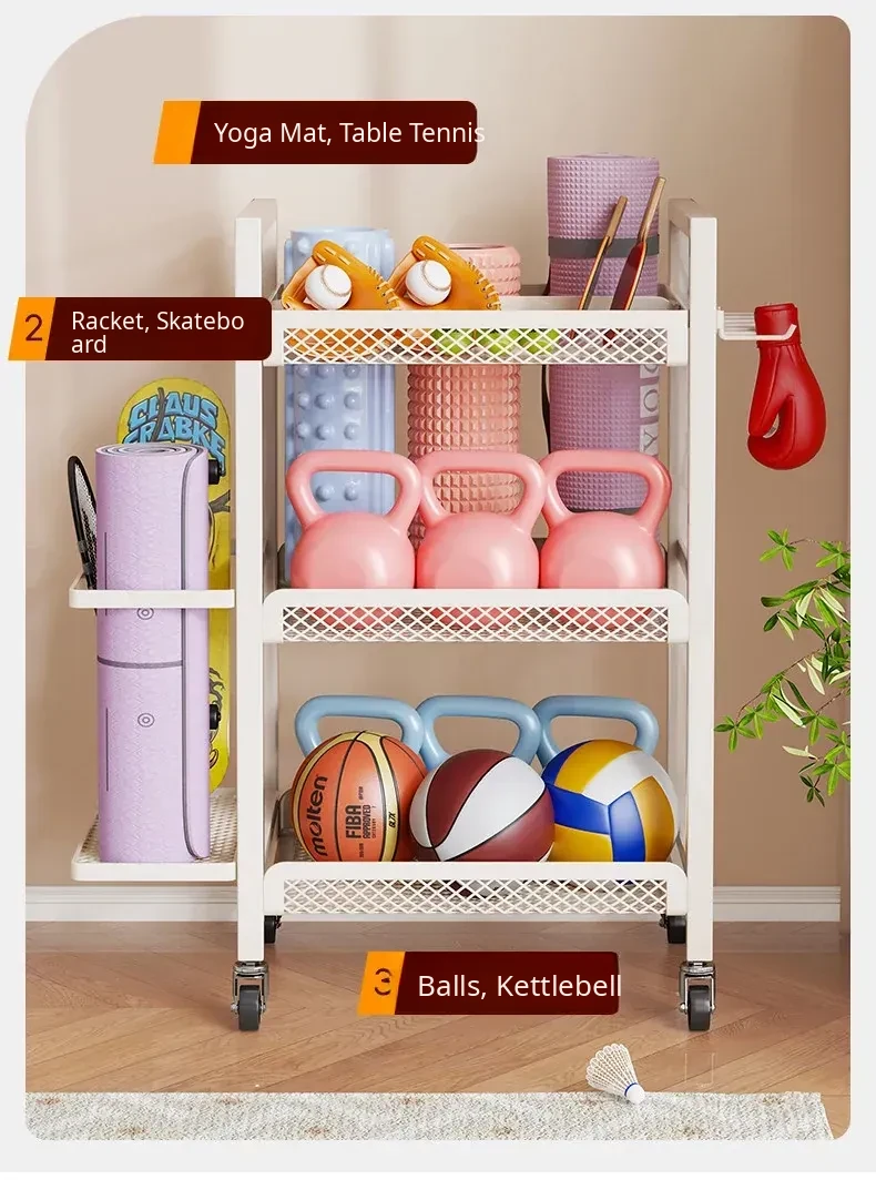 Large Capacity Home Gym Equipment Storage Rack with Wheels - Perfect for Organizing Sports Balls, Yoga Mats, Dumbbells, and Kettlebells. Keep Your Space Tidy and Workout Ready!