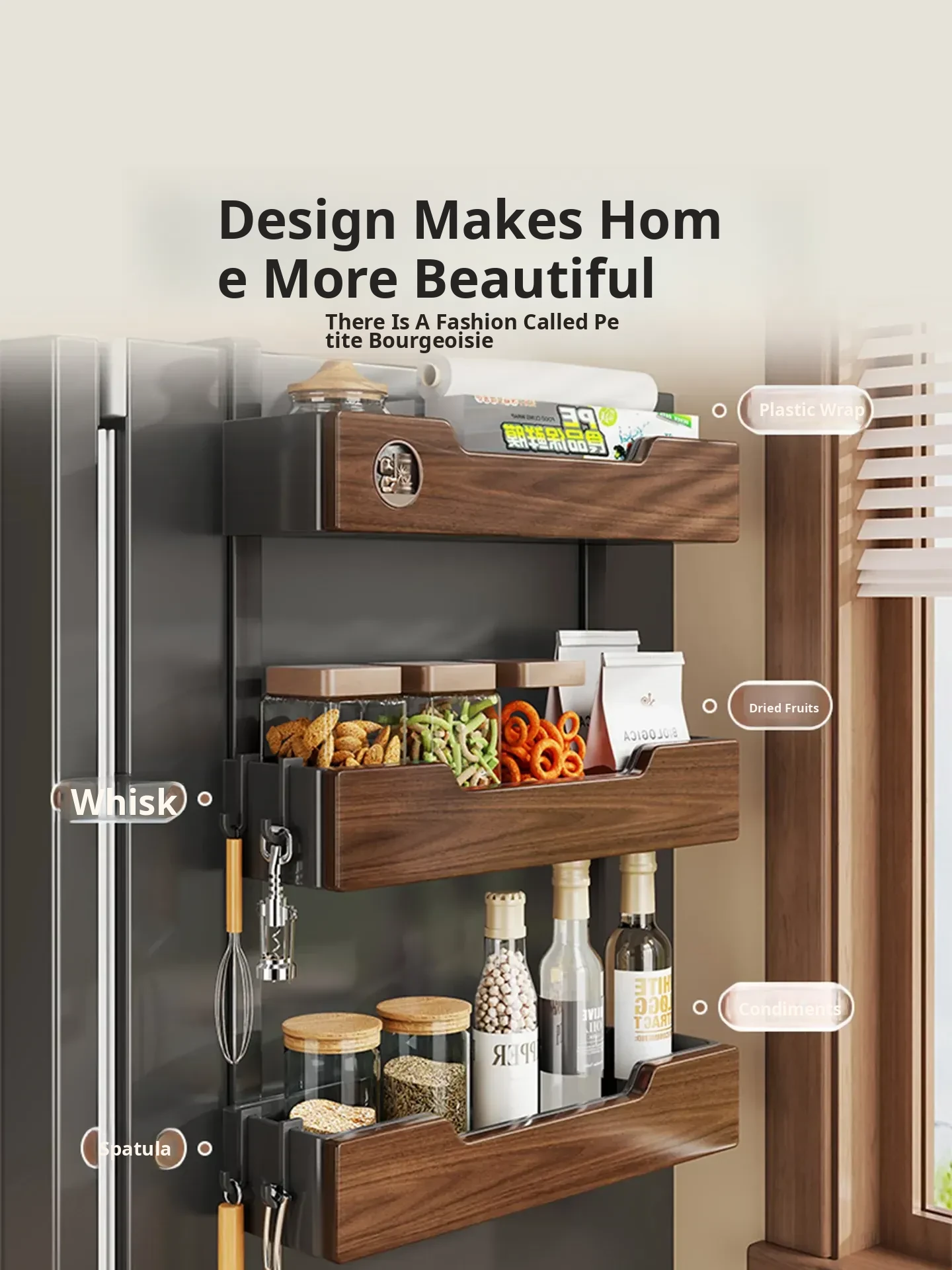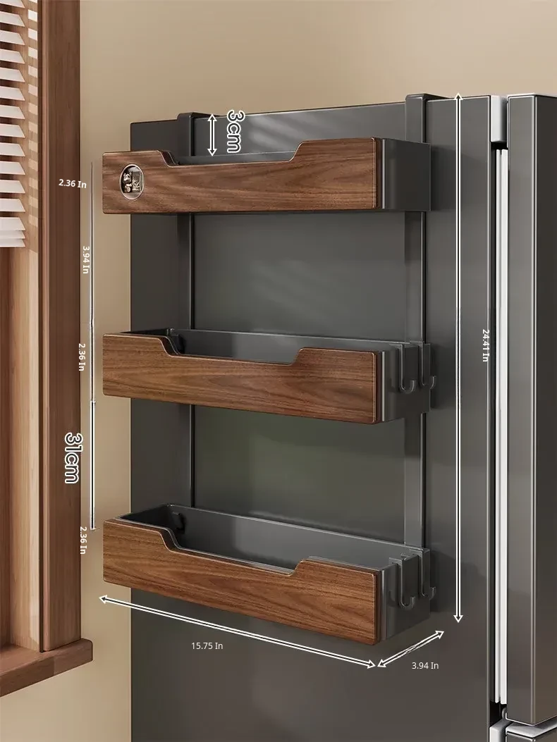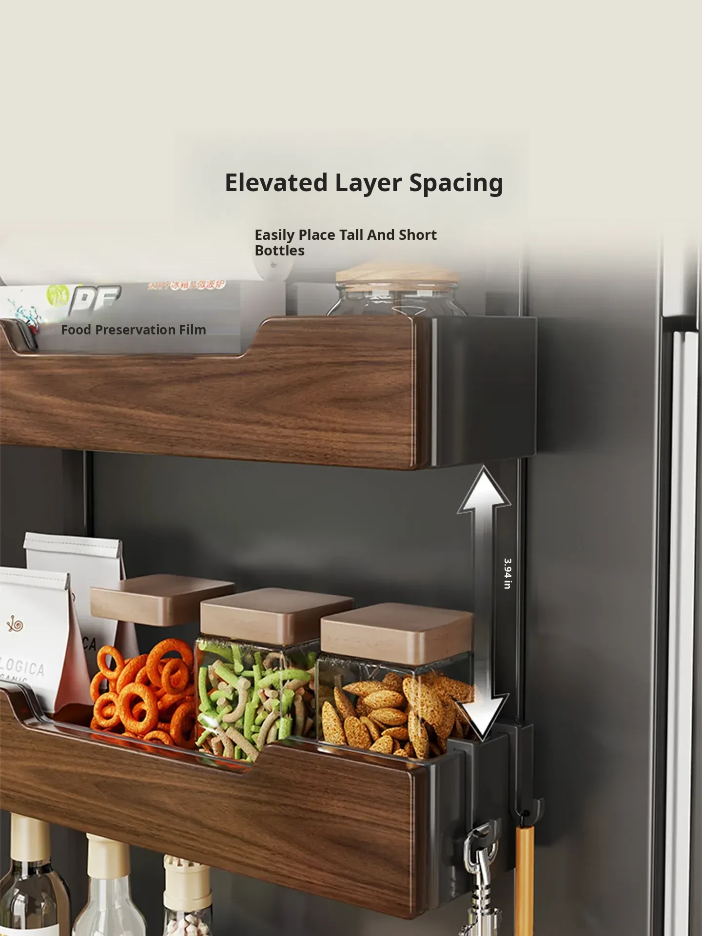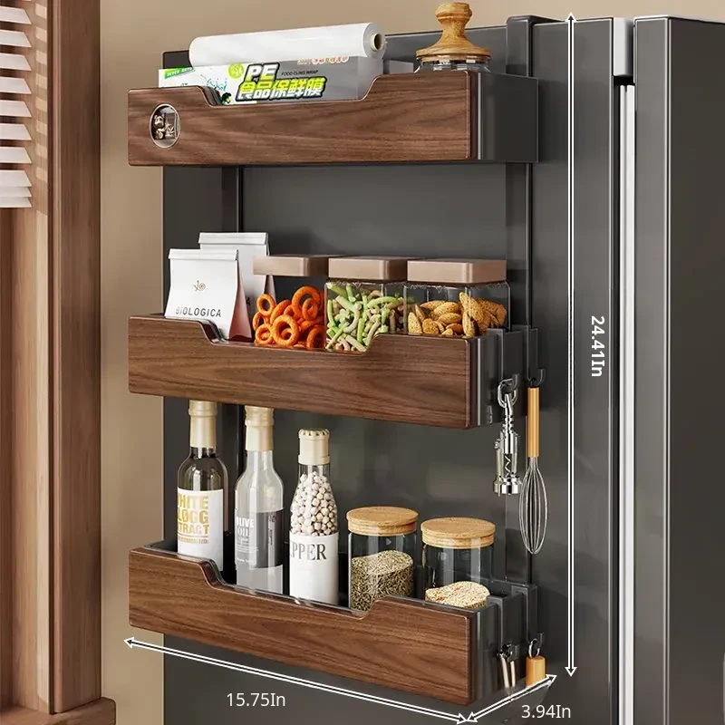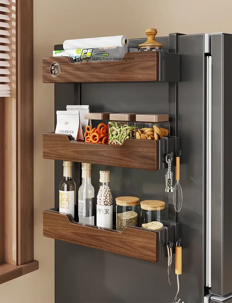 Solid Wood Refrigerator Side Storage Rack - Wall-Mounted Kitchen Organizer with No Drilling, Multi-Layer Spice Rack, Perfect for Efficient Storage and Easy Access to Your Favorite Ingredients!