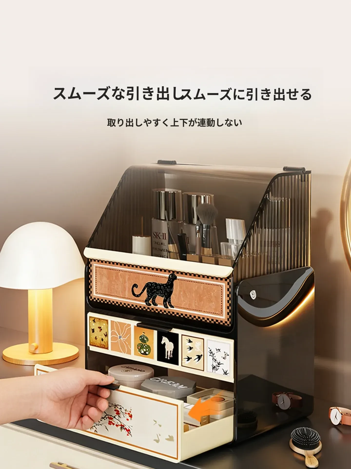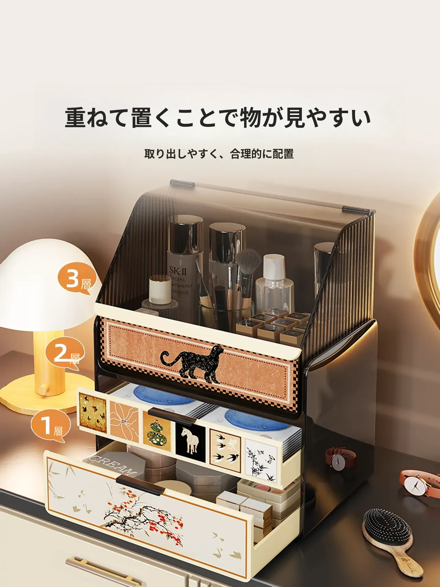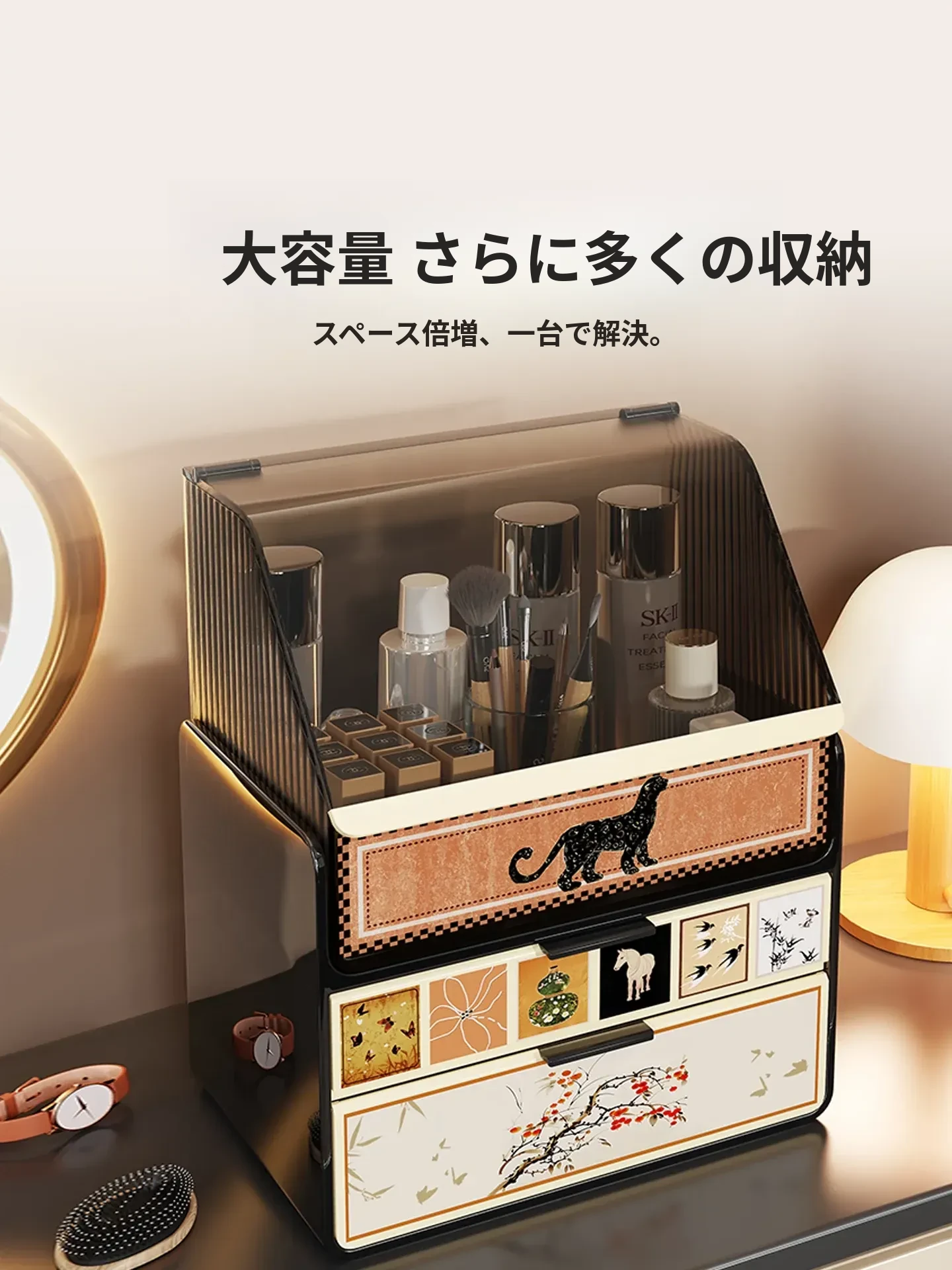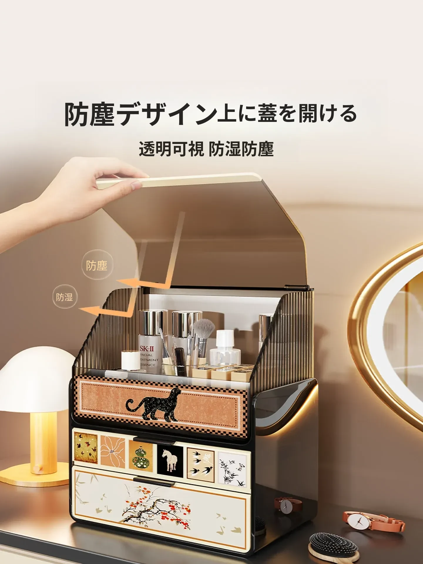 高級感あふれるメイクアップ収納ボックス!デスクトップ用フリップトップデザインで、ホコリを防ぎながら大容量でスキンケアやフェイスマスクをスマートに整理。あなたのドレッサーをおしゃれに演出!