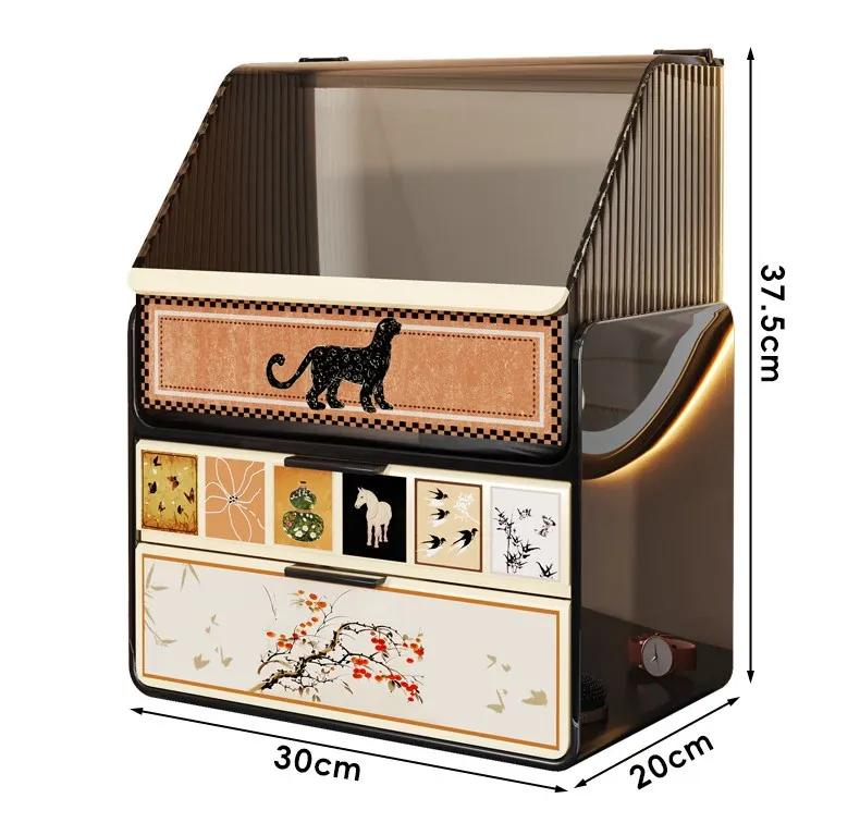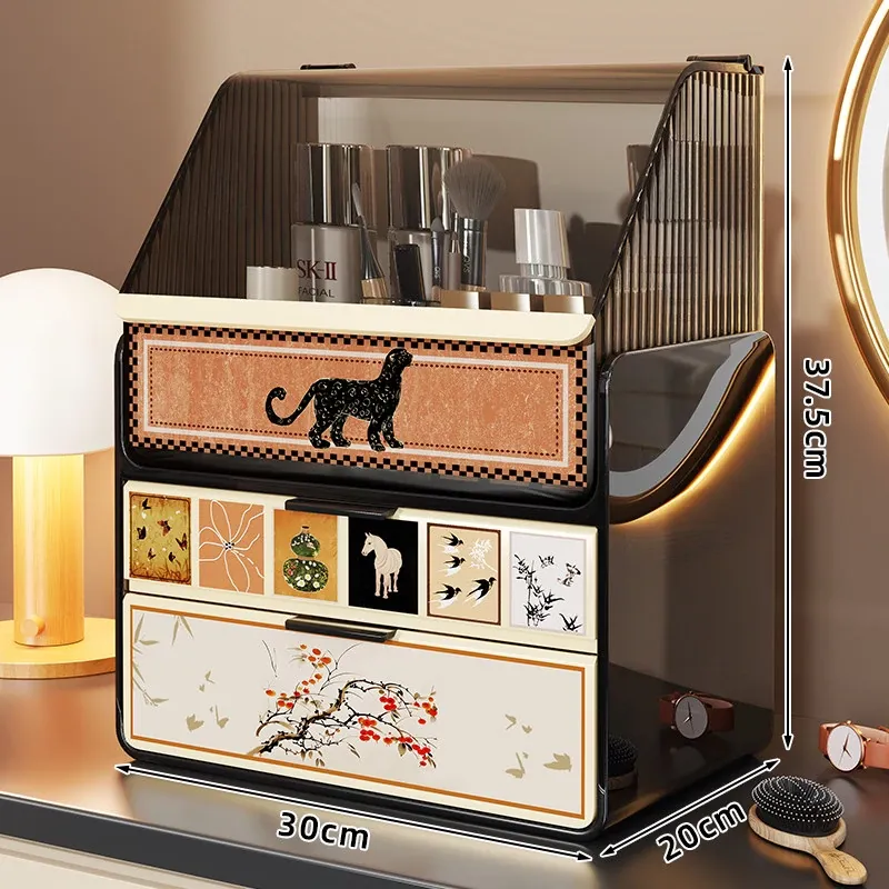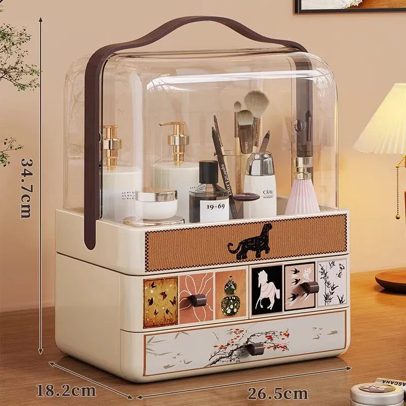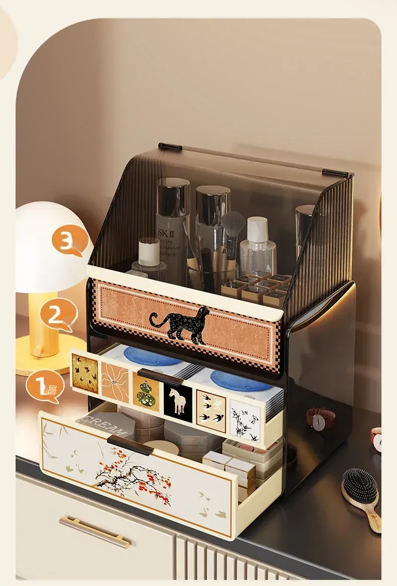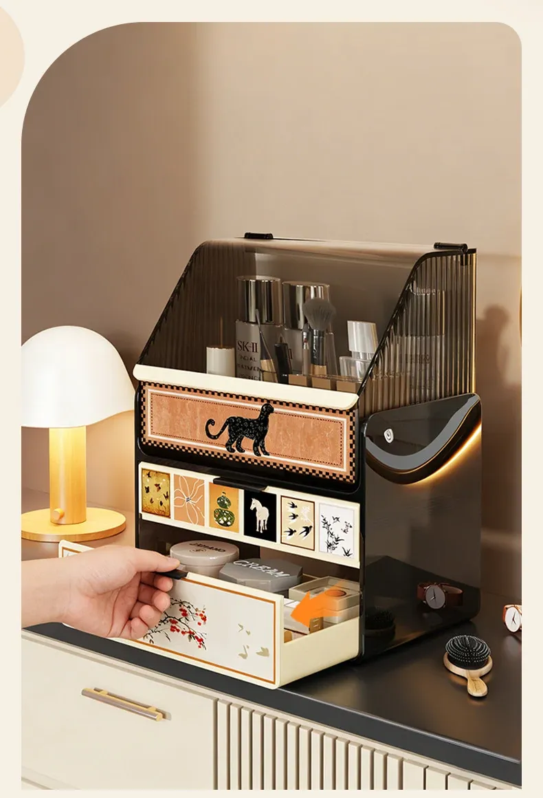 高級感あふれるメイクアップ収納ボックス!デスクトップ用フリップトップデザインで、ホコリを防ぎながら大容量でスキンケアやフェイスマスクをスマートに整理。あなたのドレッサーをおしゃれに演出!