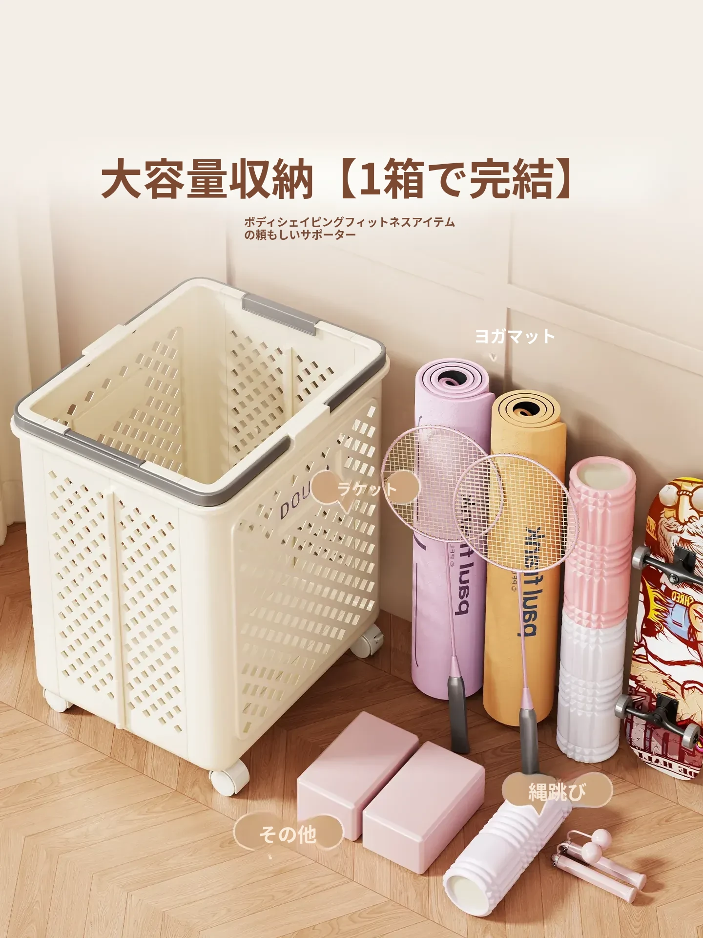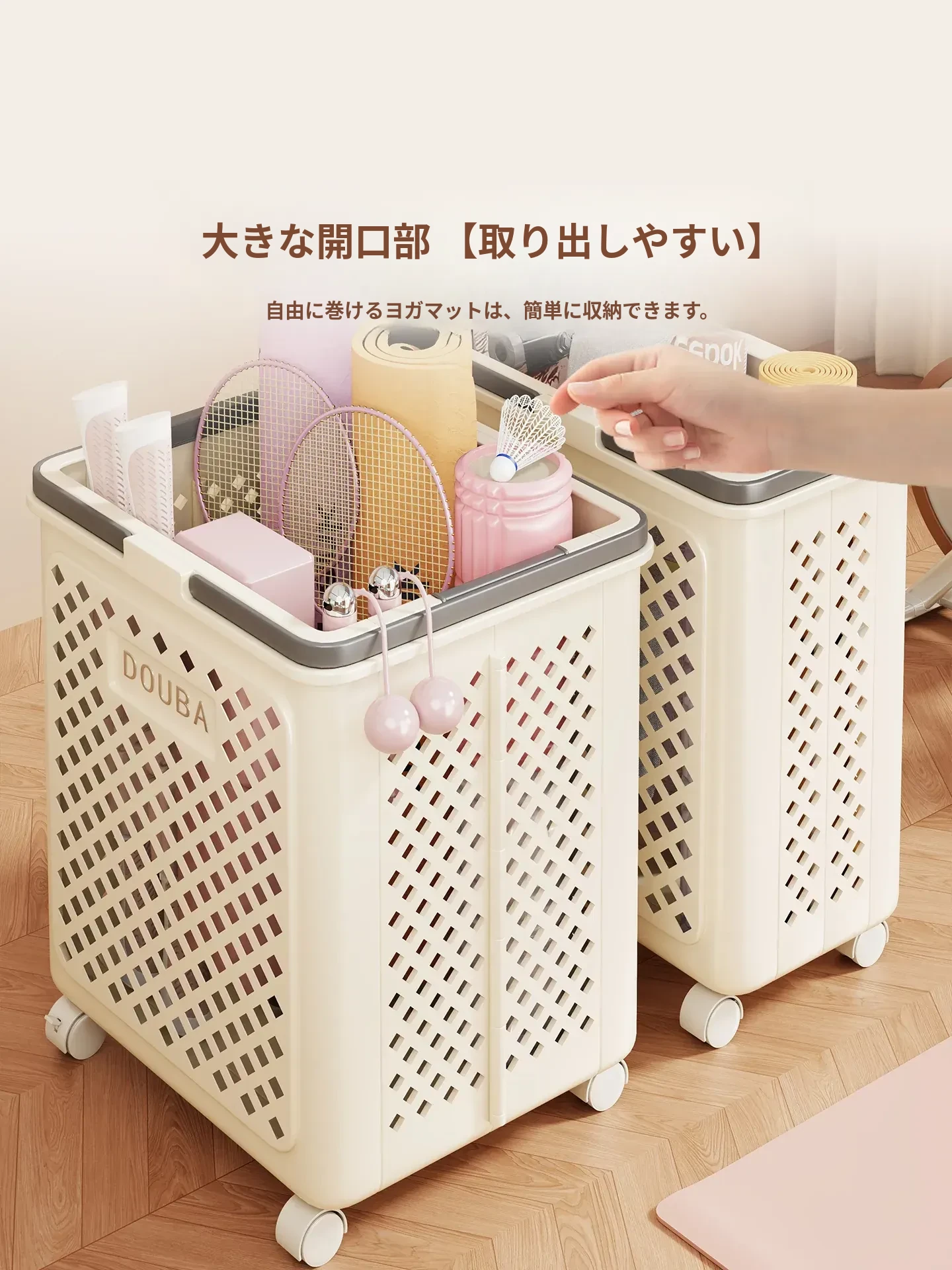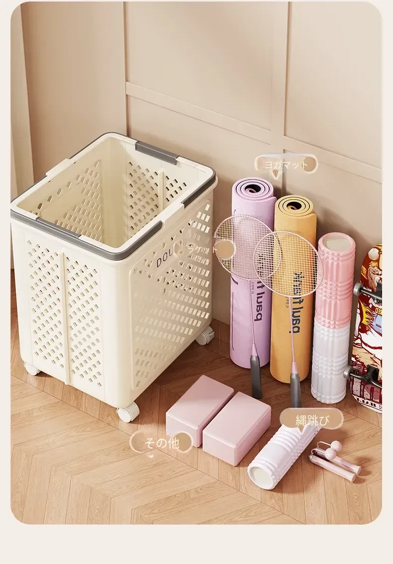 ヨガマット収納バスケット|家用|キャスター付きで移動ラクラク|フィットネス器具整理の必需品|折りたたみ可能なバドミントン収納バスケット|スッキリ片付けて快適な空間を実現!