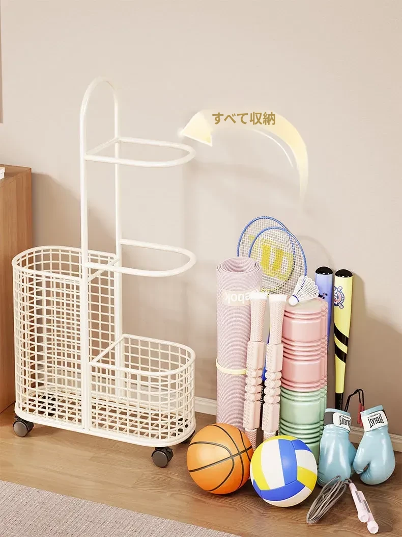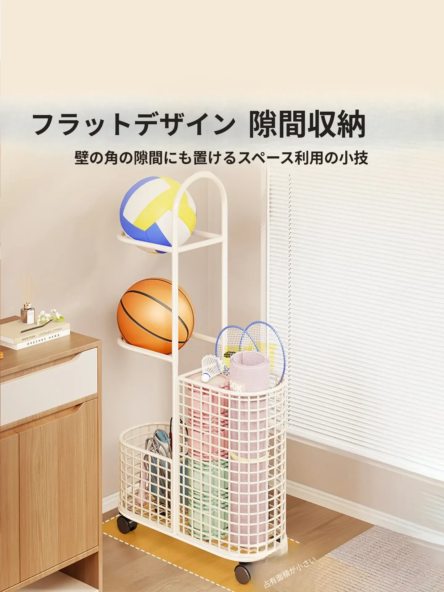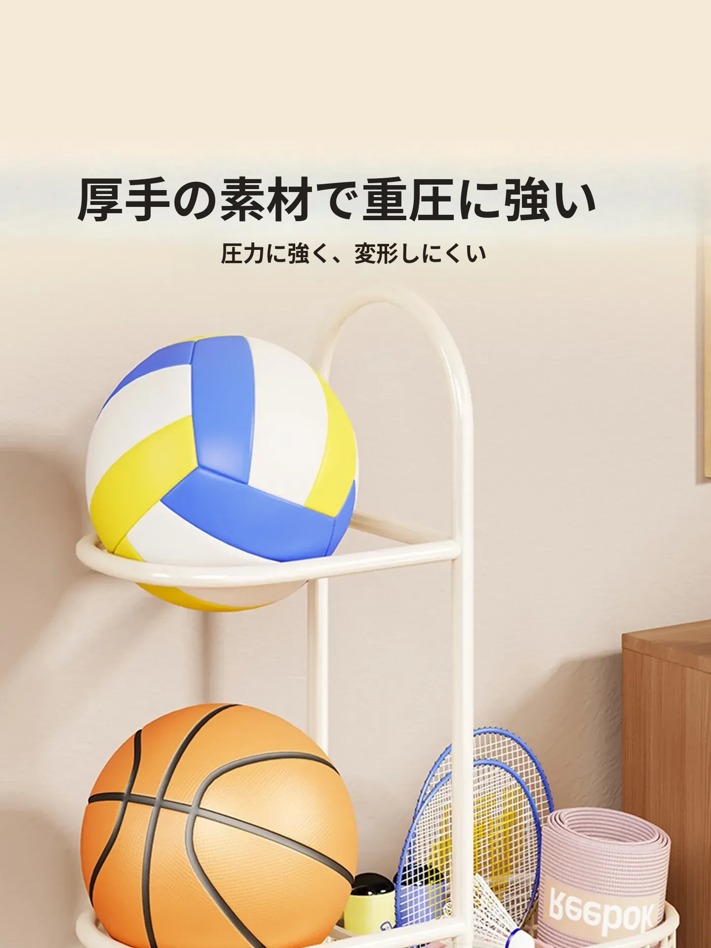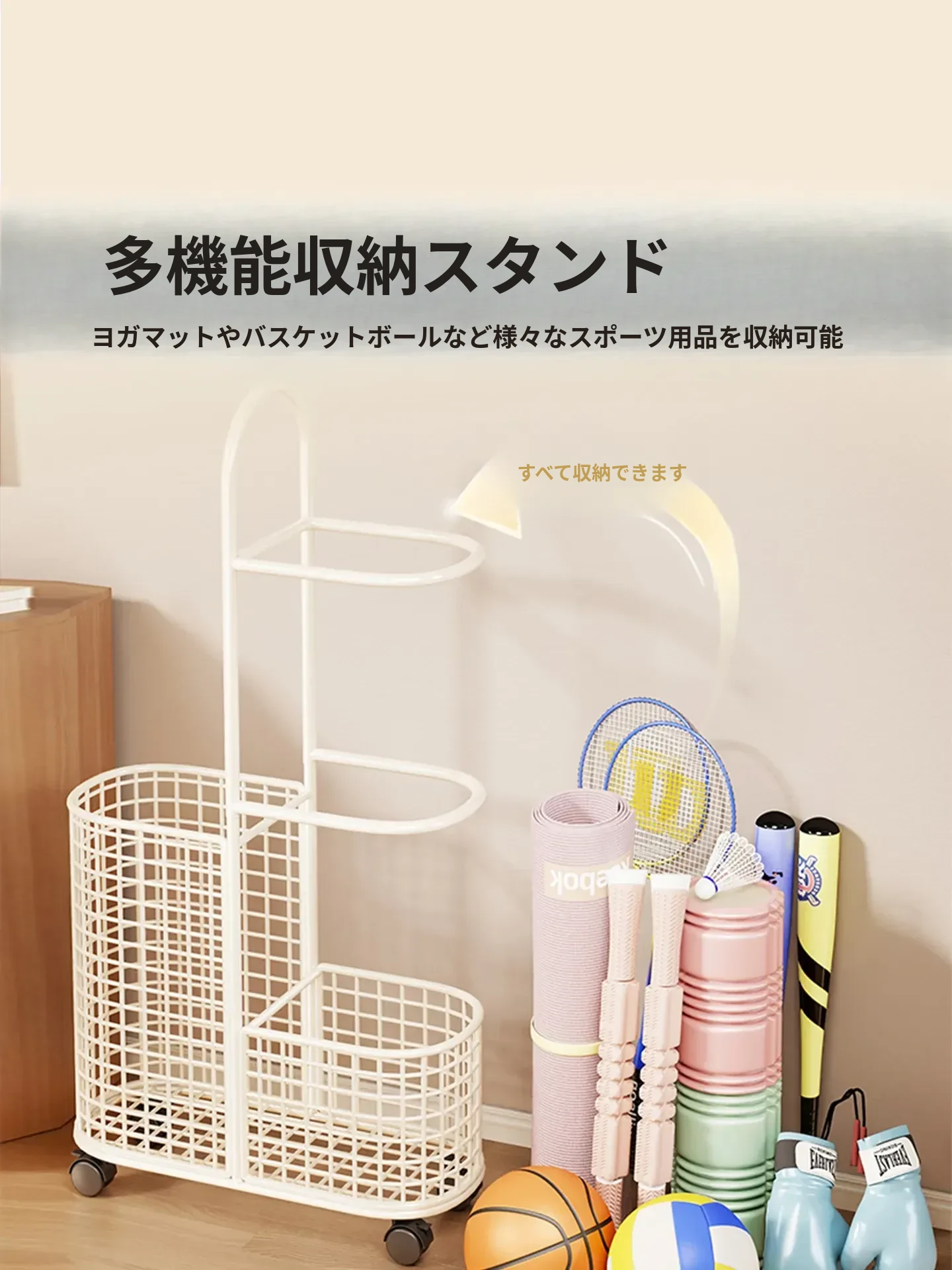 大容量バスケットボール収納ラック!移動可能なキャスター付きで、家でもスポーツ用品をスッキリ整理。サッカーやバレーボールの道具も一緒に収納できる、おしゃれで便利なフィットネスアイテム!