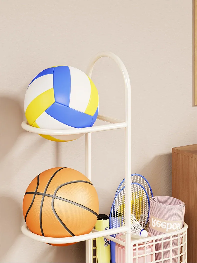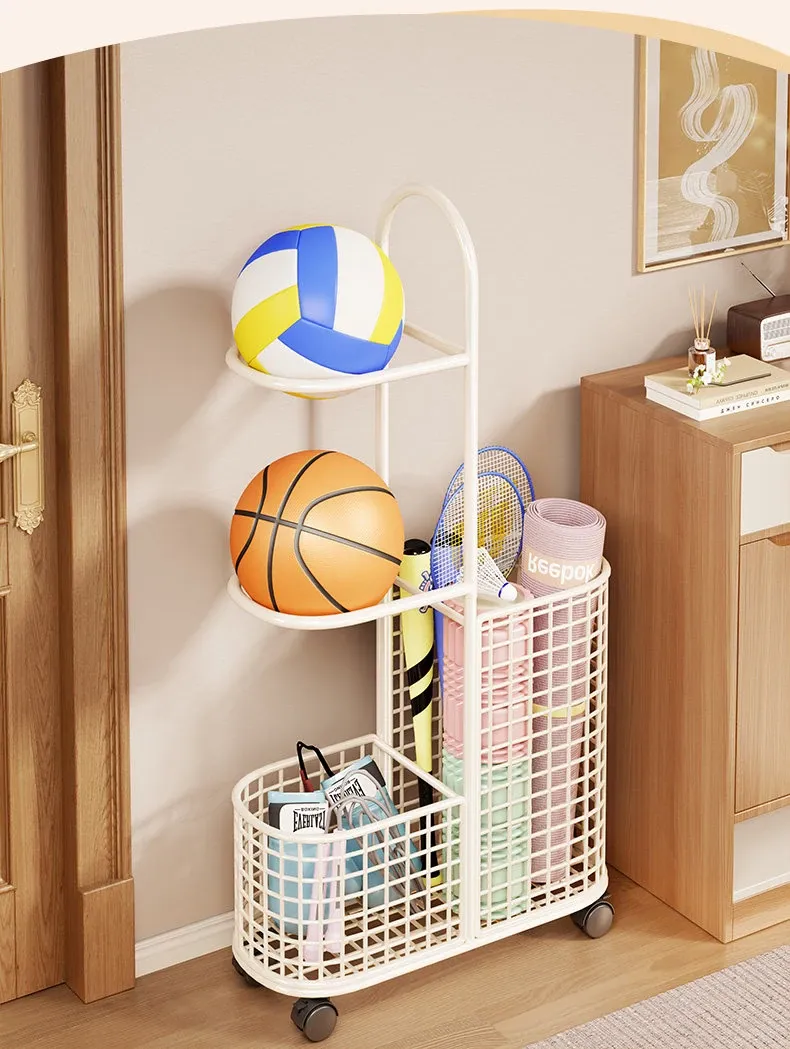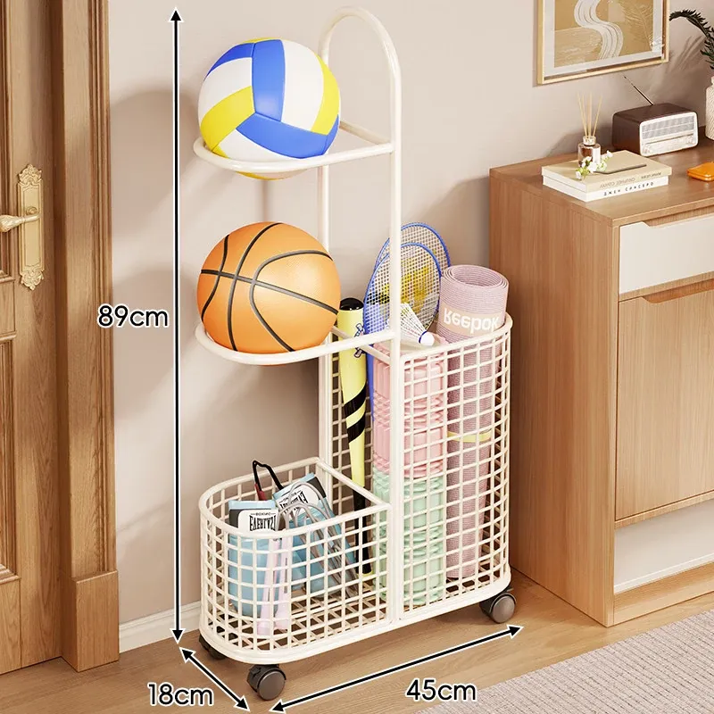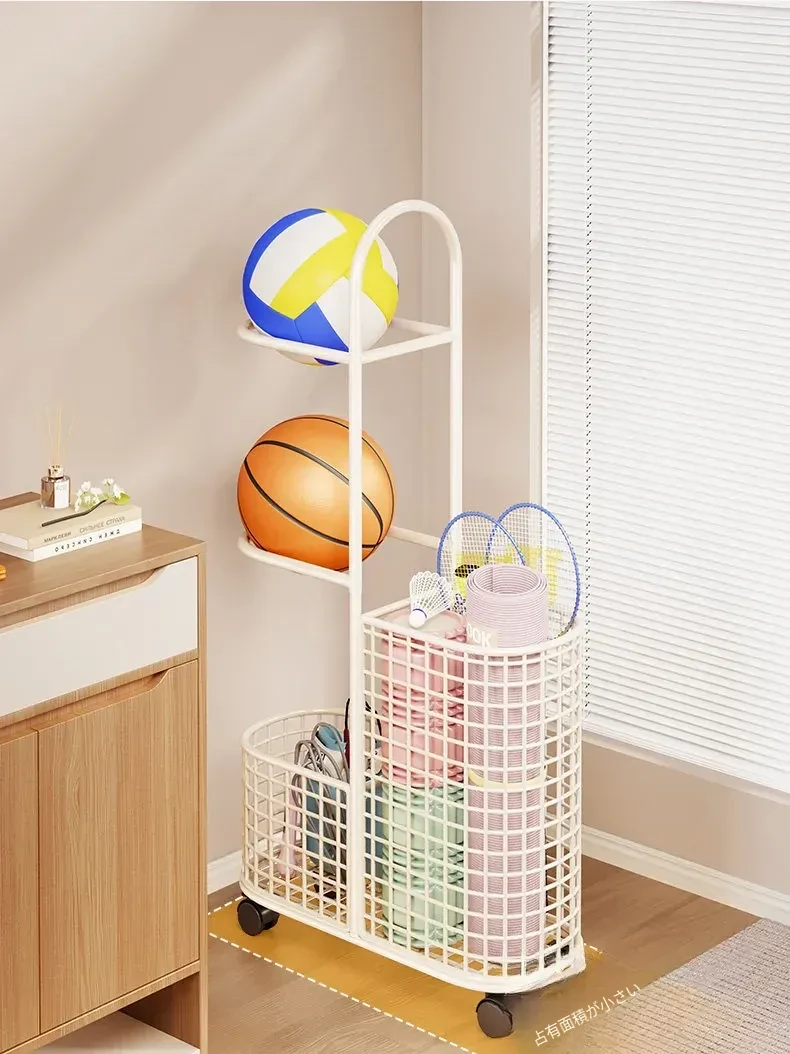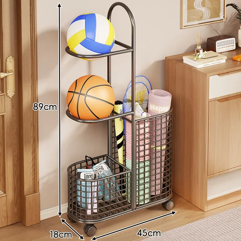 大容量バスケットボール収納ラック!移動可能なキャスター付きで、家でもスポーツ用品をスッキリ整理。サッカーやバレーボールの道具も一緒に収納できる、おしゃれで便利なフィットネスアイテム!