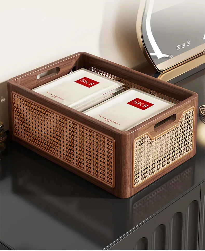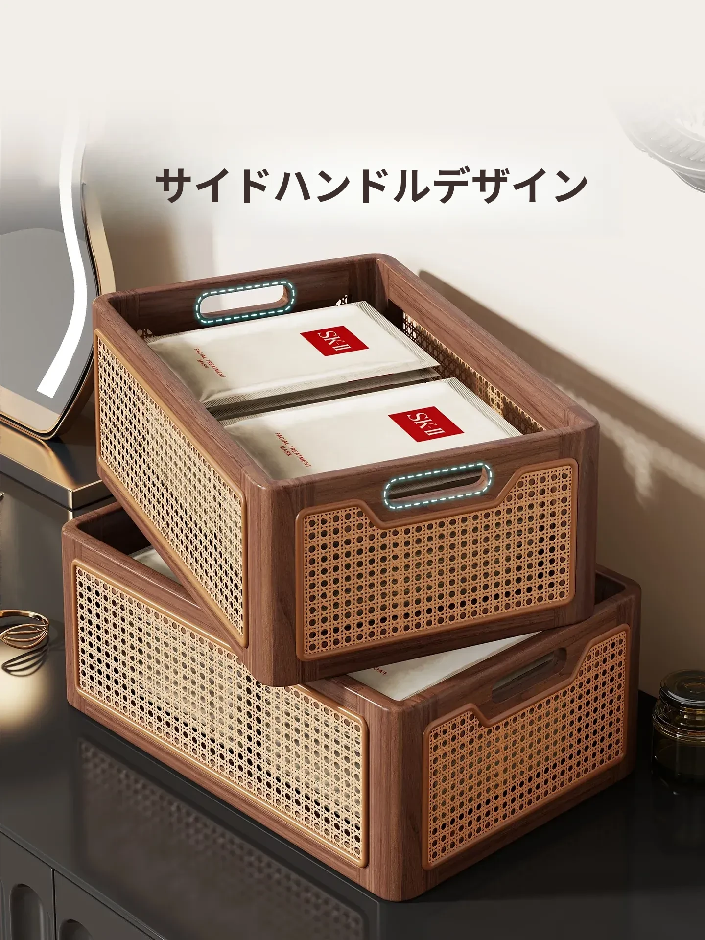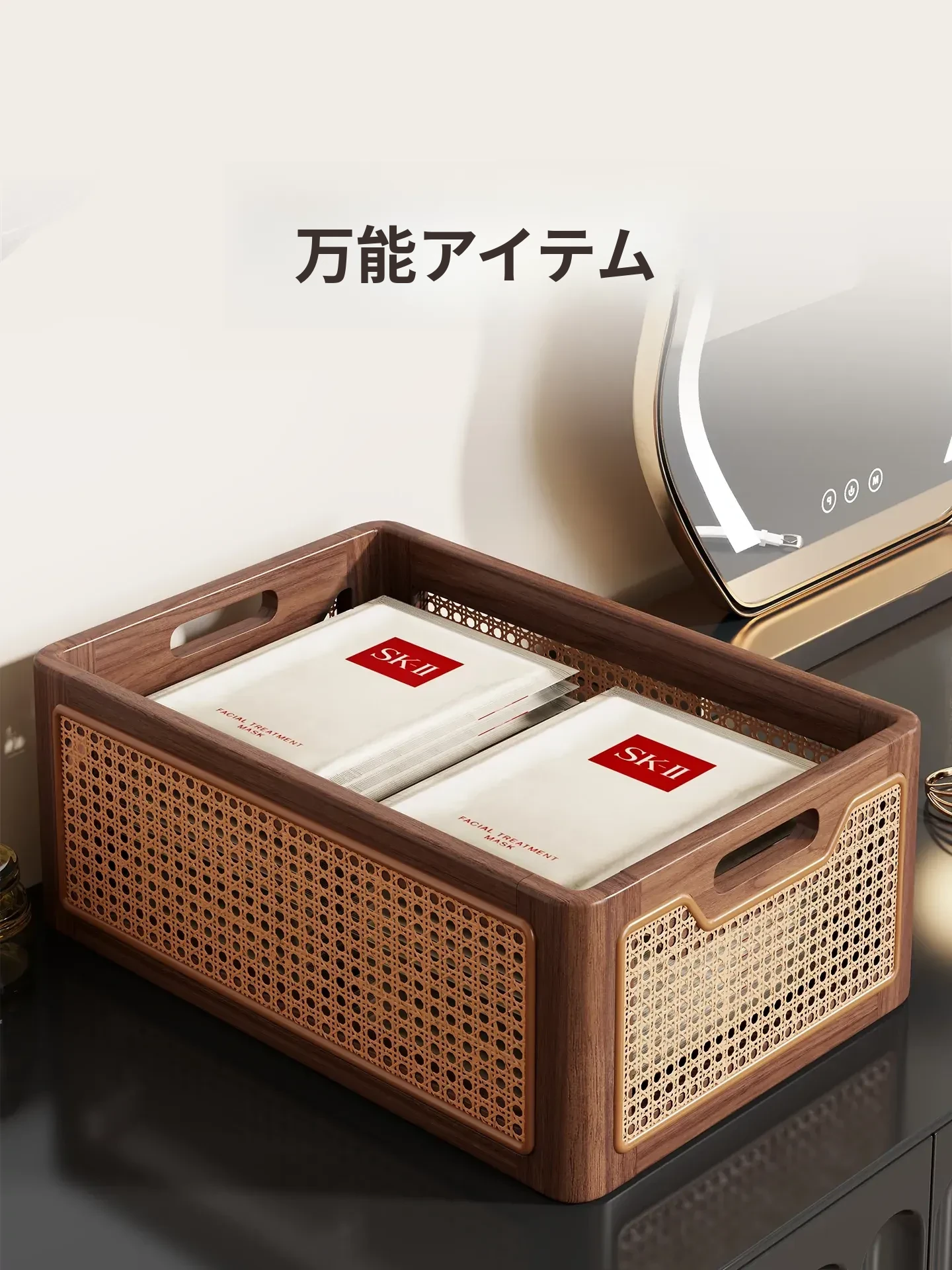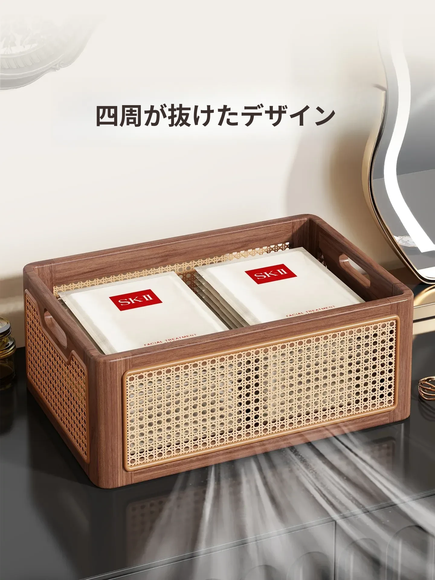 高品質な無垢材とバスケット編みの収納ボックス!化粧品や小物、スナック、おもちゃをスッキリ整理。おしゃれなデザインでデスク周りを美しく演出する長方形ストレージバスケット。