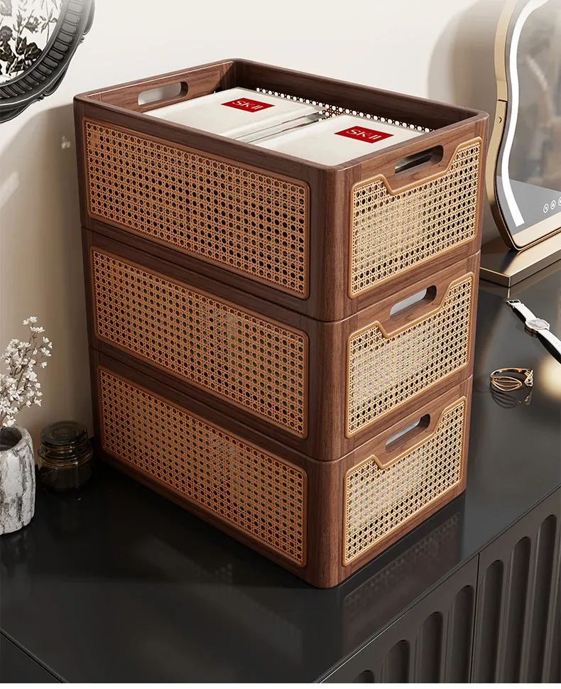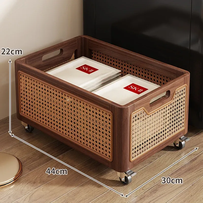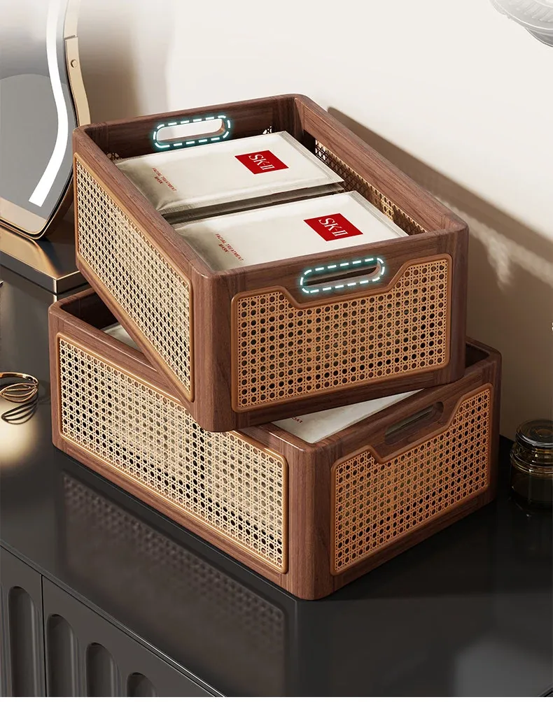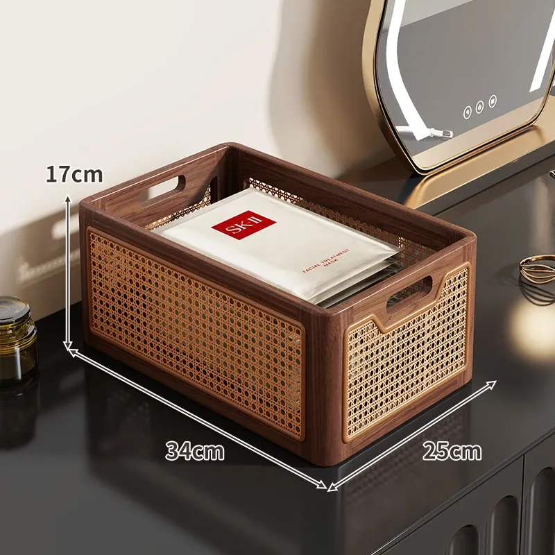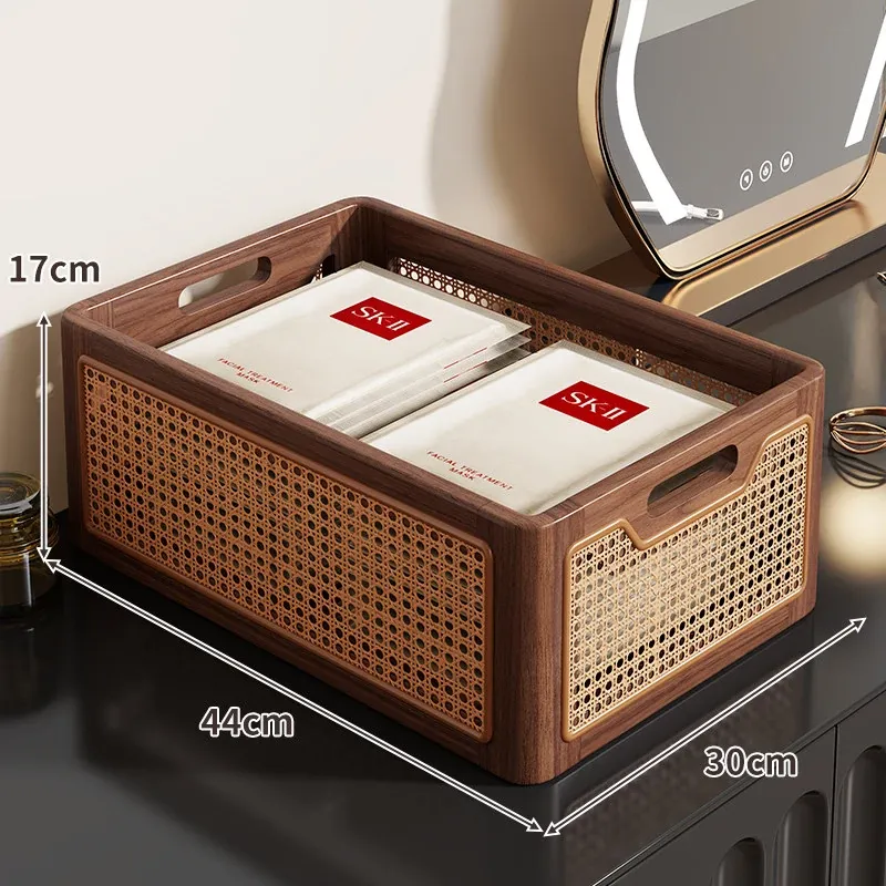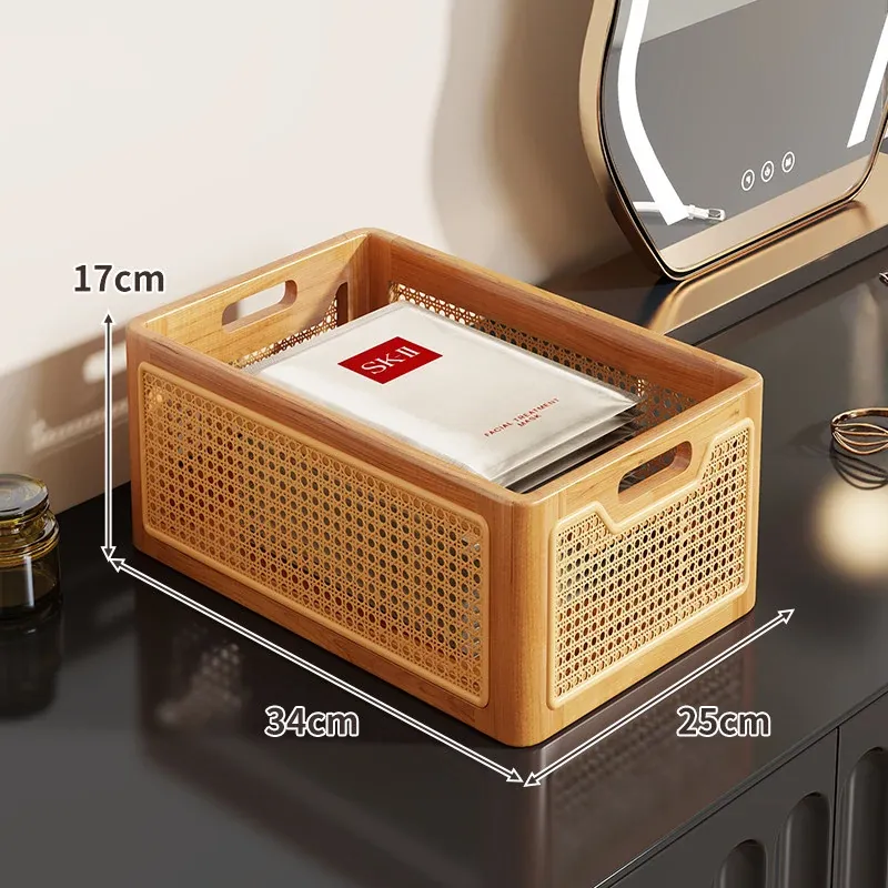 高品質な無垢材とバスケット編みの収納ボックス!化粧品や小物、スナック、おもちゃをスッキリ整理。おしゃれなデザインでデスク周りを美しく演出する長方形ストレージバスケット。