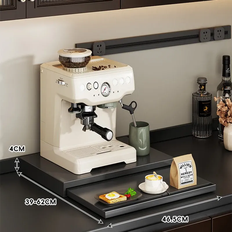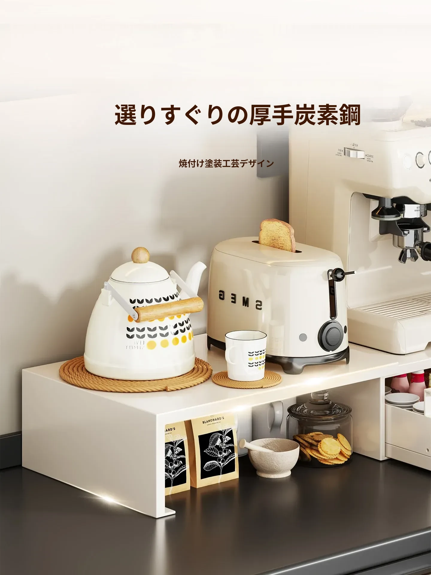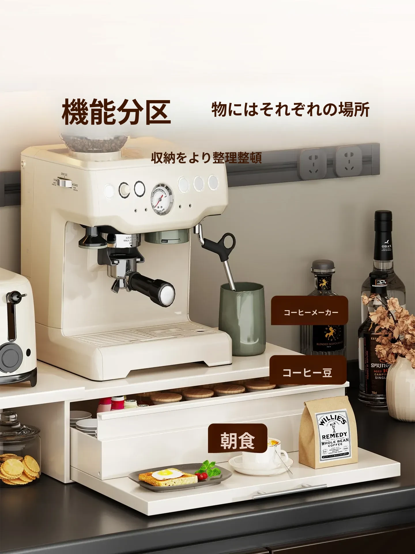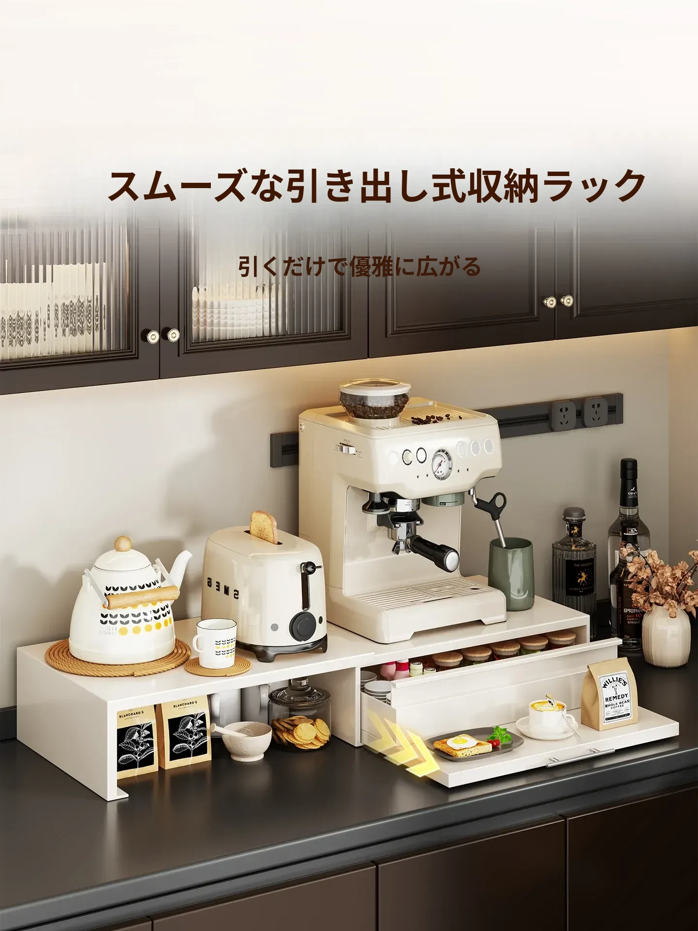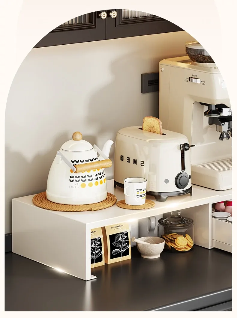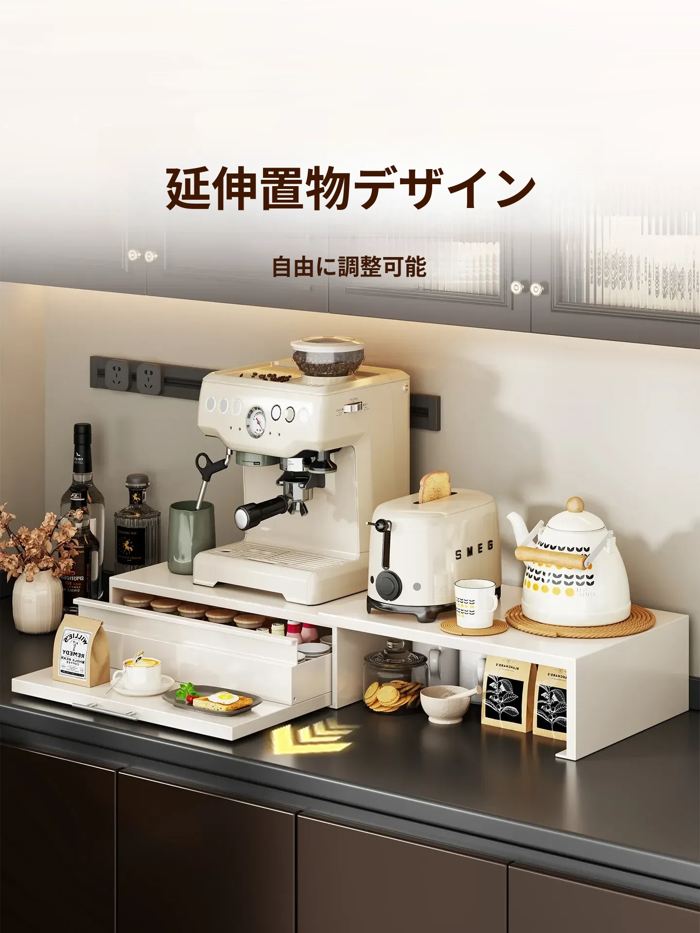コーヒーメーカー置き台&スナック収納ラック - 厨房の整理整頓に最適!電気炊飯器も置ける頑丈な引き出し付き台面スタンドで、スペースを有効活用し、美しいキッチンを実現!