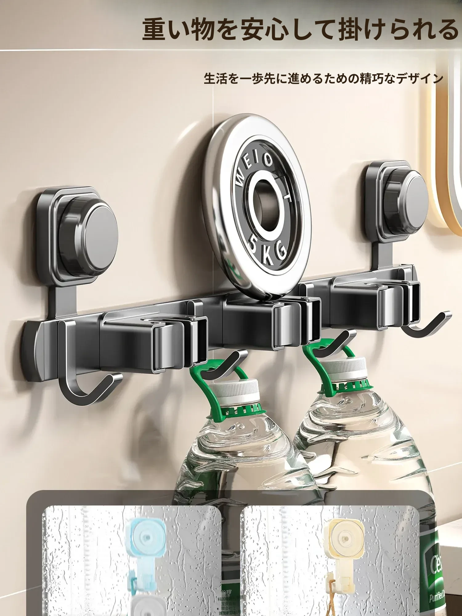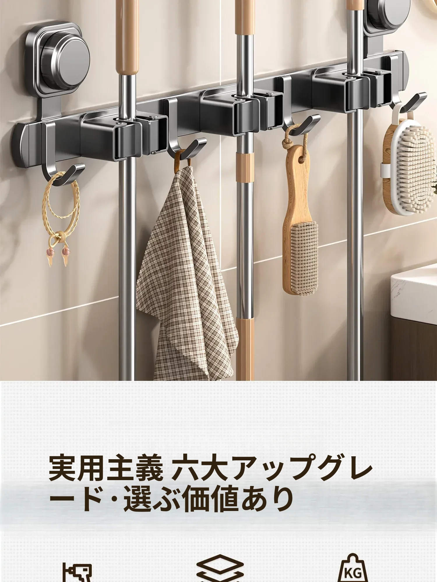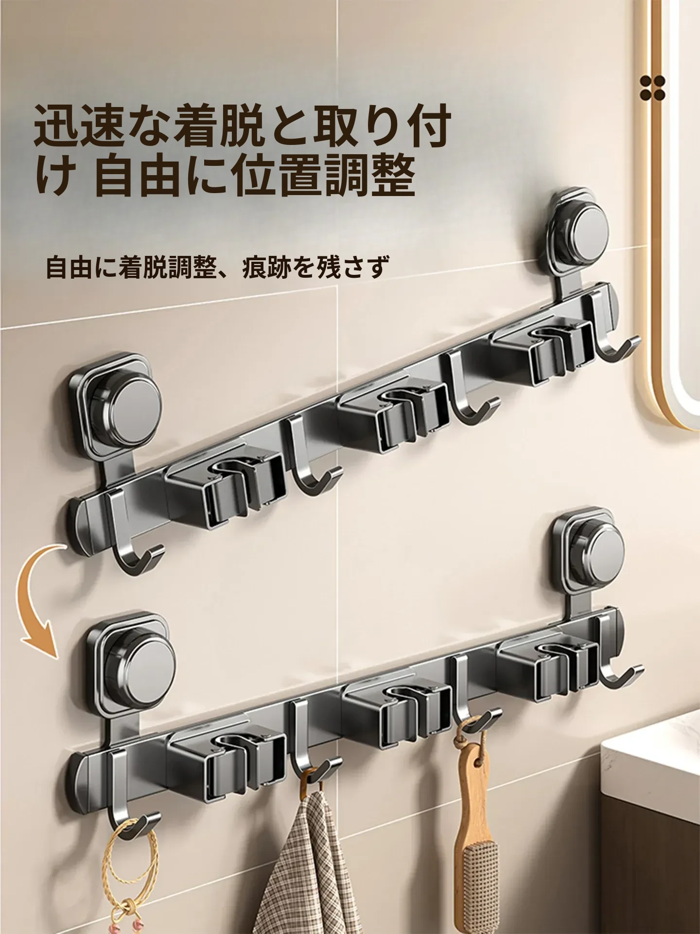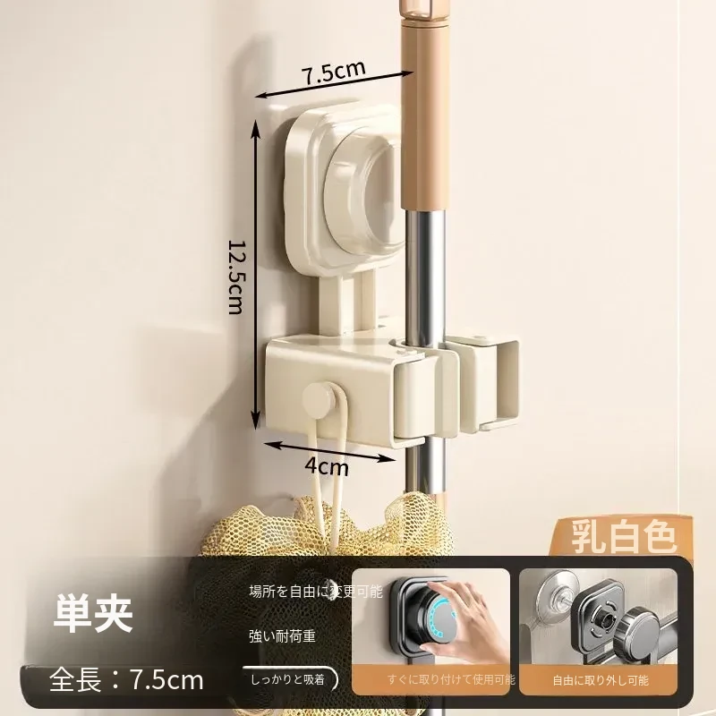 吸盤モップ壁掛けクリップ - 取り付け不要のフックで、トイレの壁に固定!掃除道具をスッキリ収納できる便利なスタンド。ブラシやほうきも一緒に整理整頓!