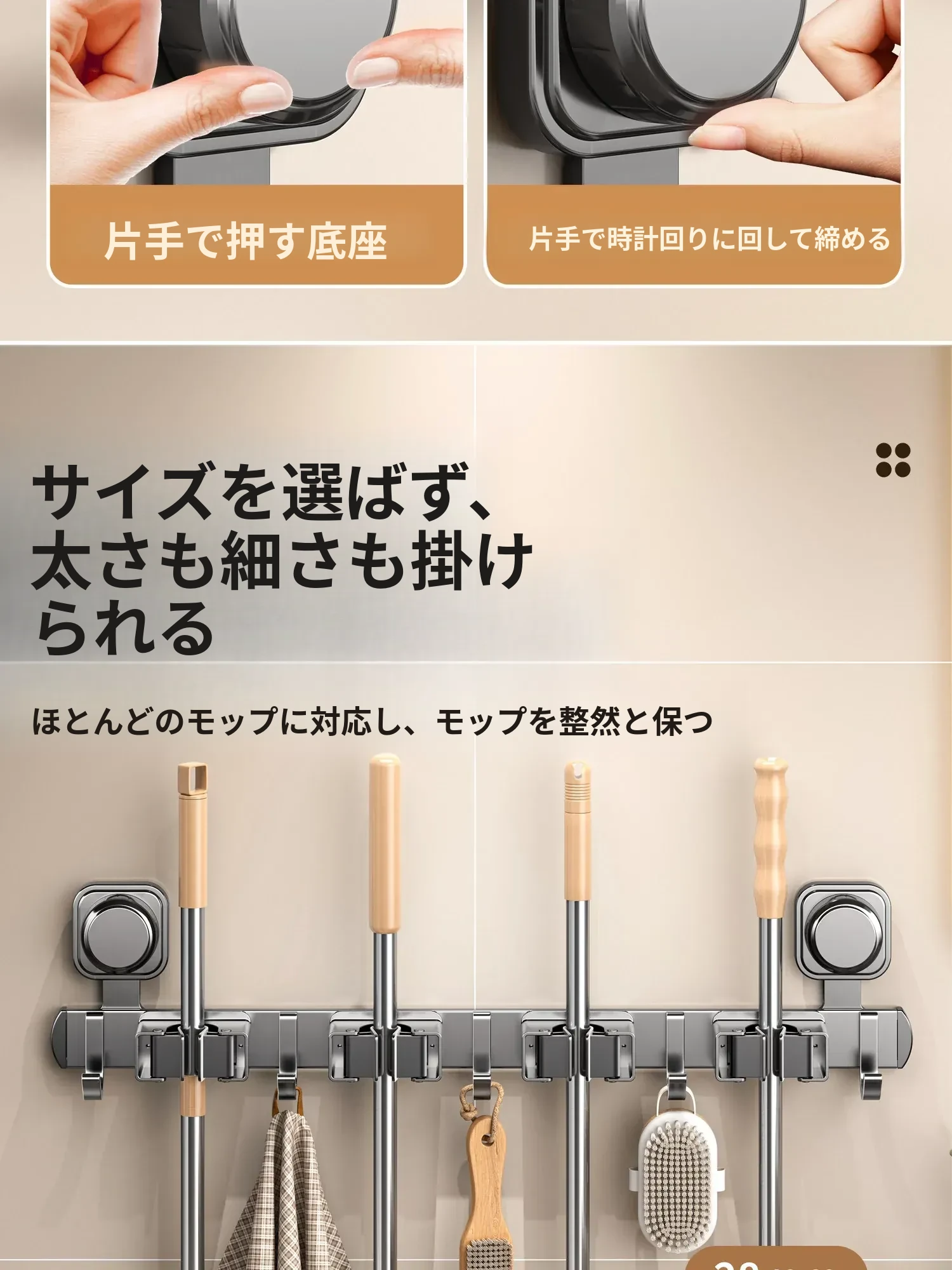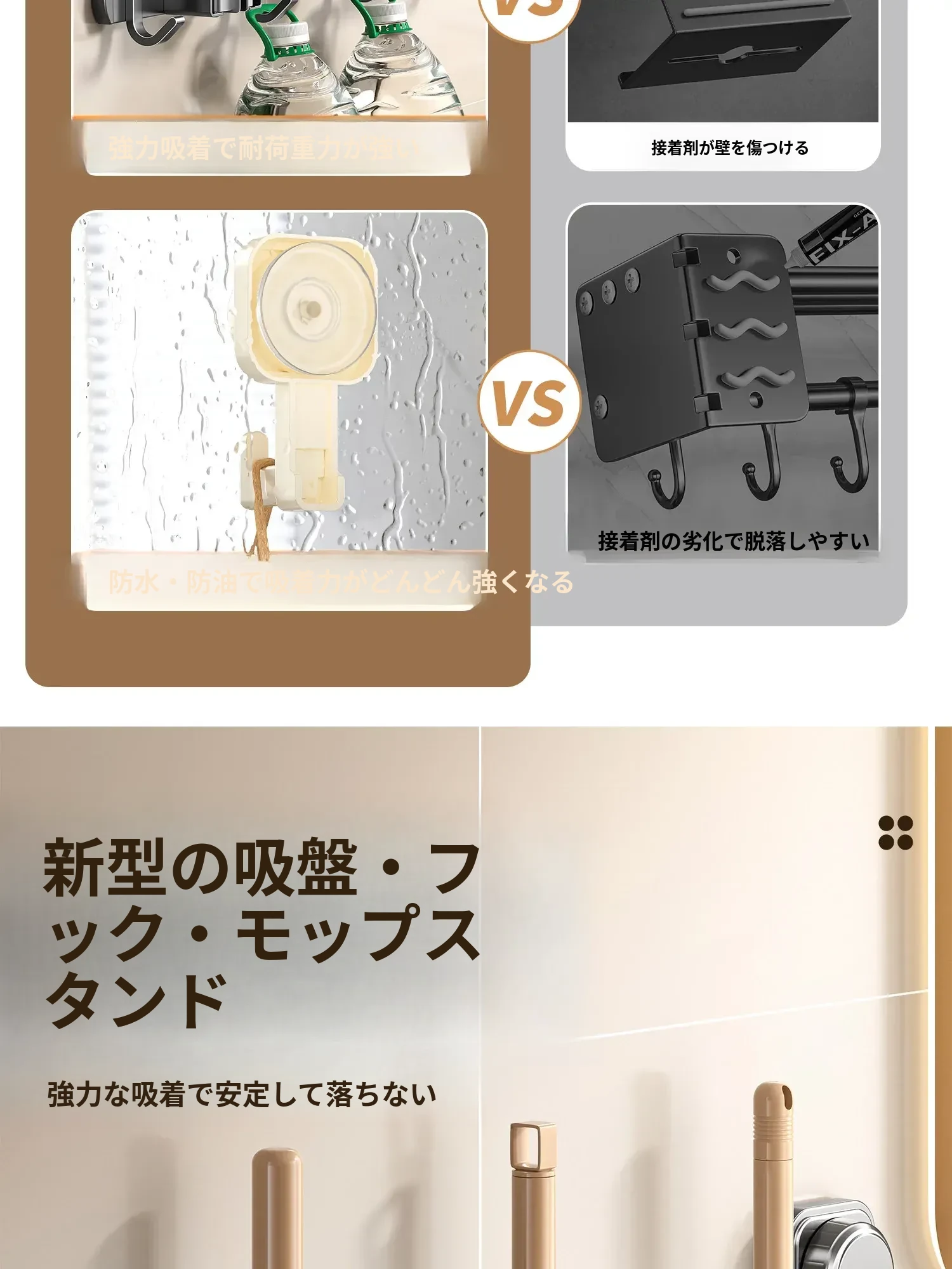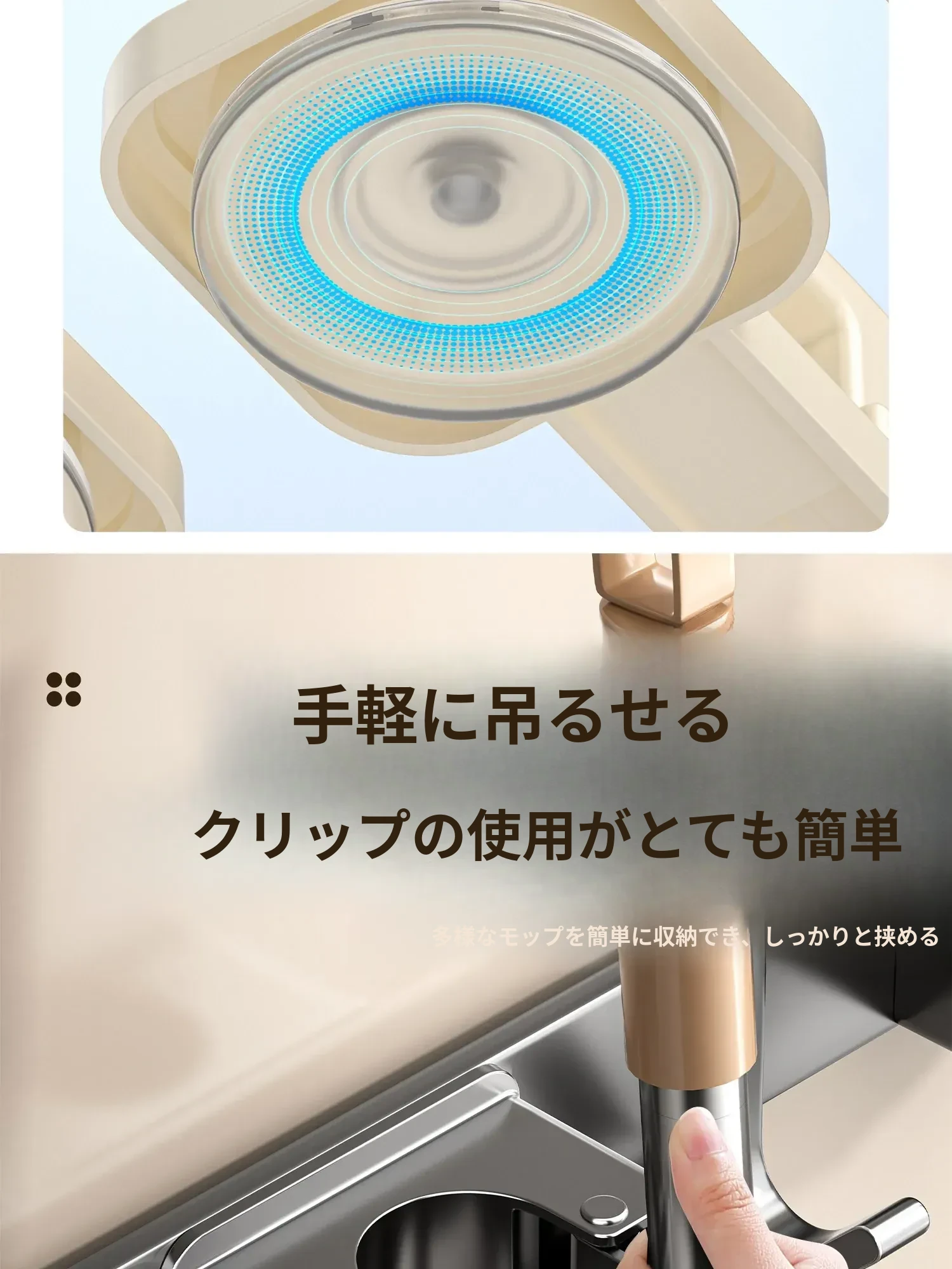 吸盤モップ壁掛けクリップ - 取り付け不要のフックで、トイレの壁に固定!掃除道具をスッキリ収納できる便利なスタンド。ブラシやほうきも一緒に整理整頓!