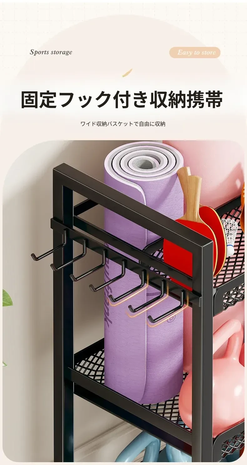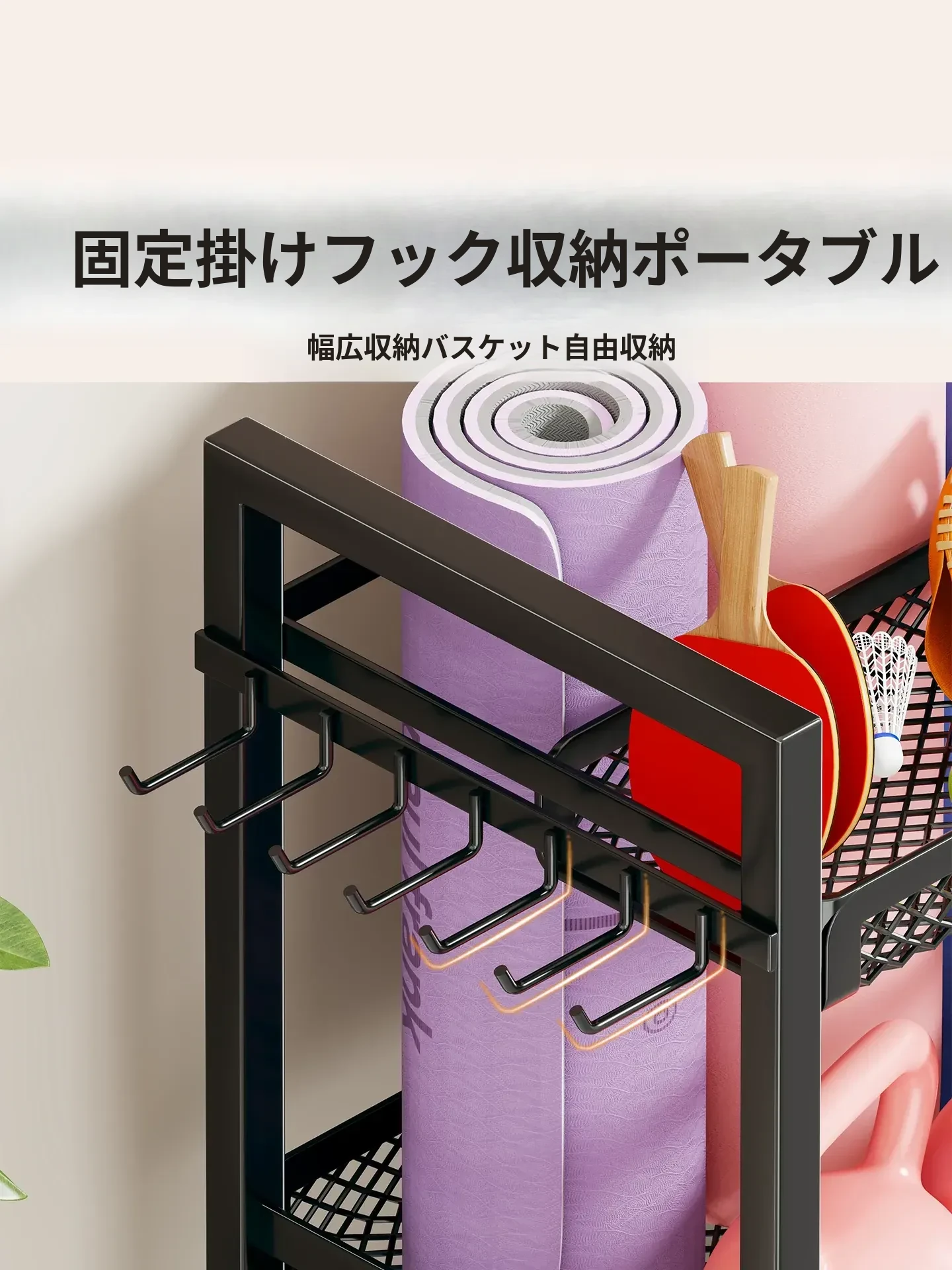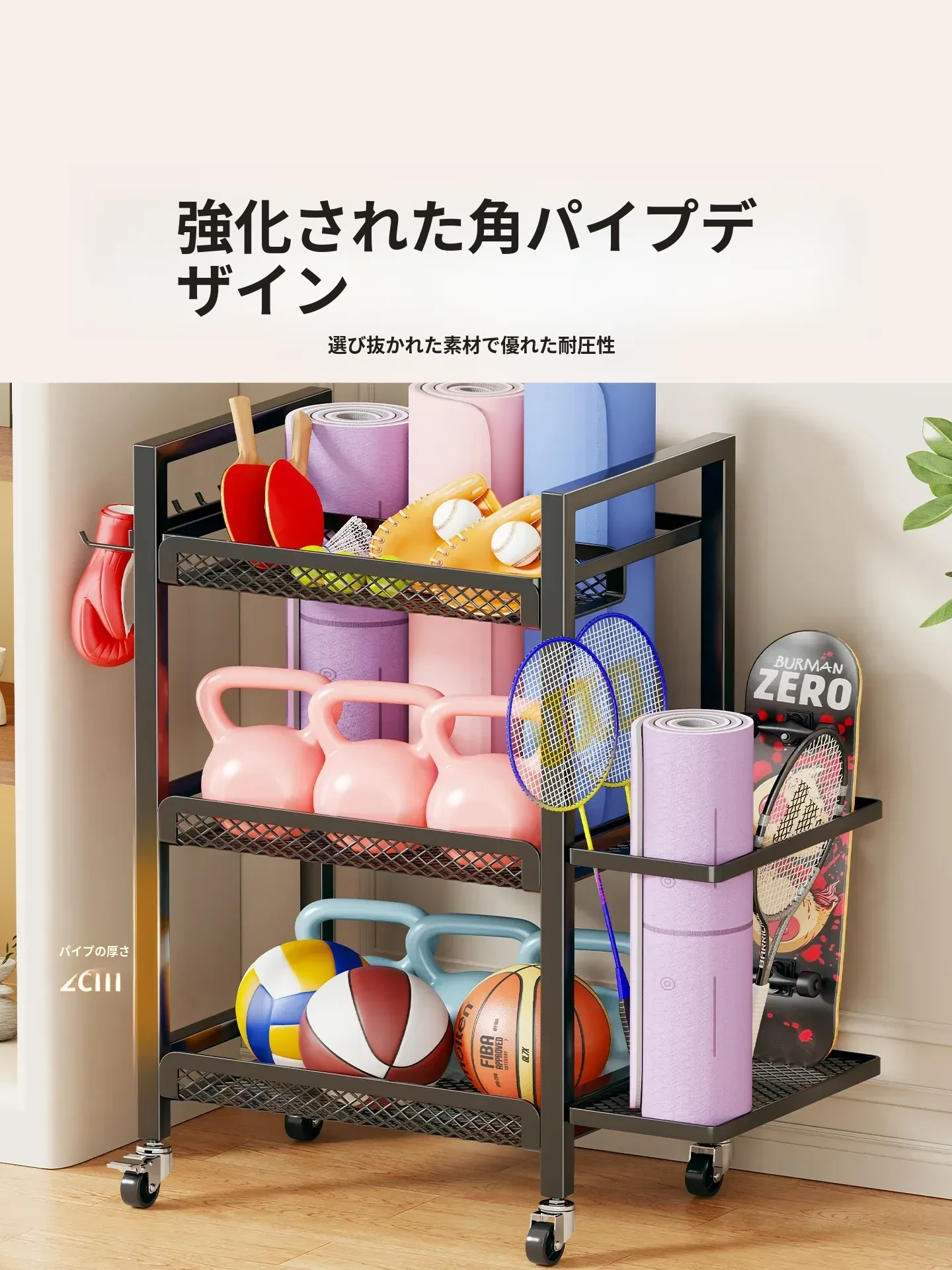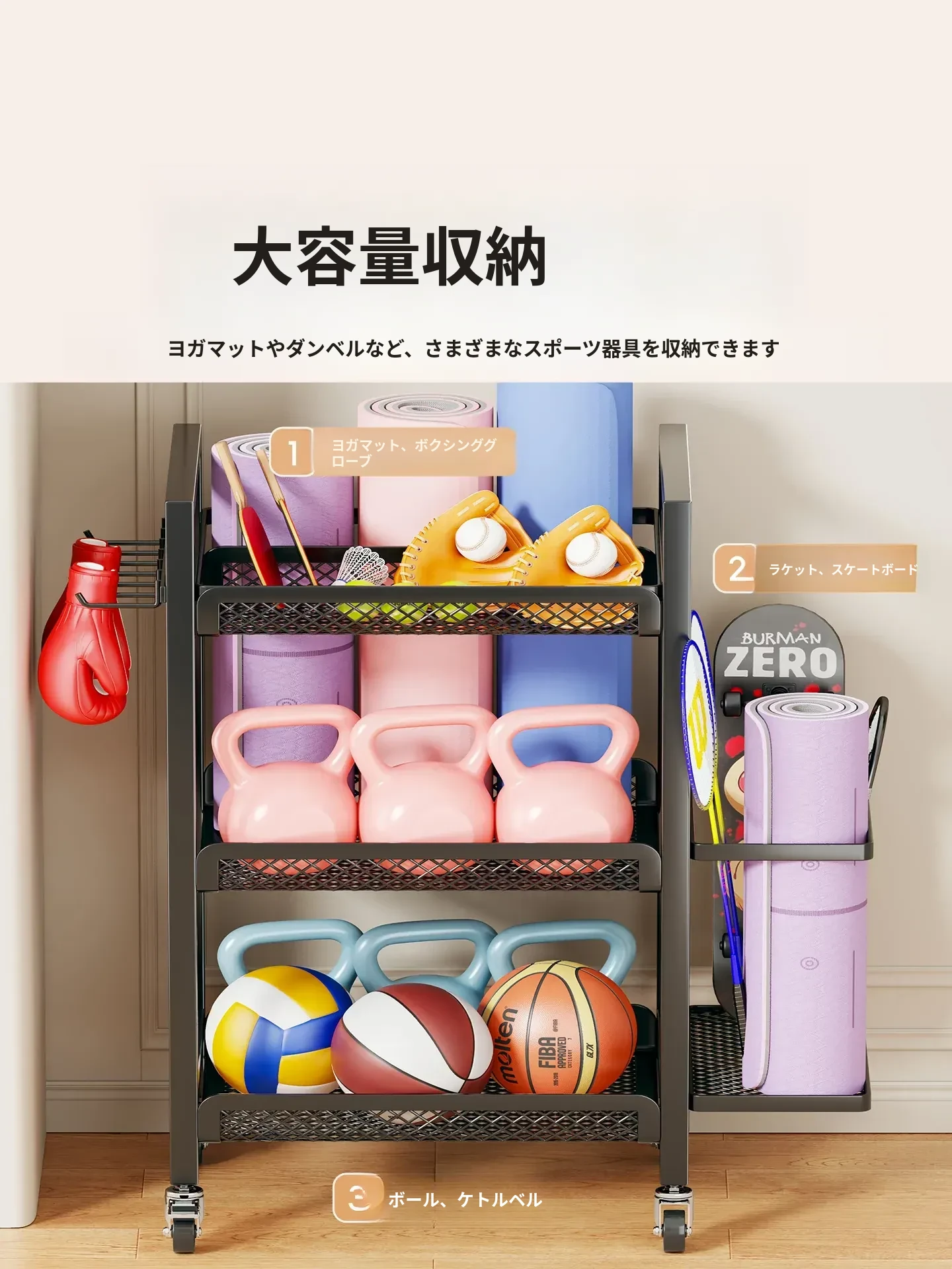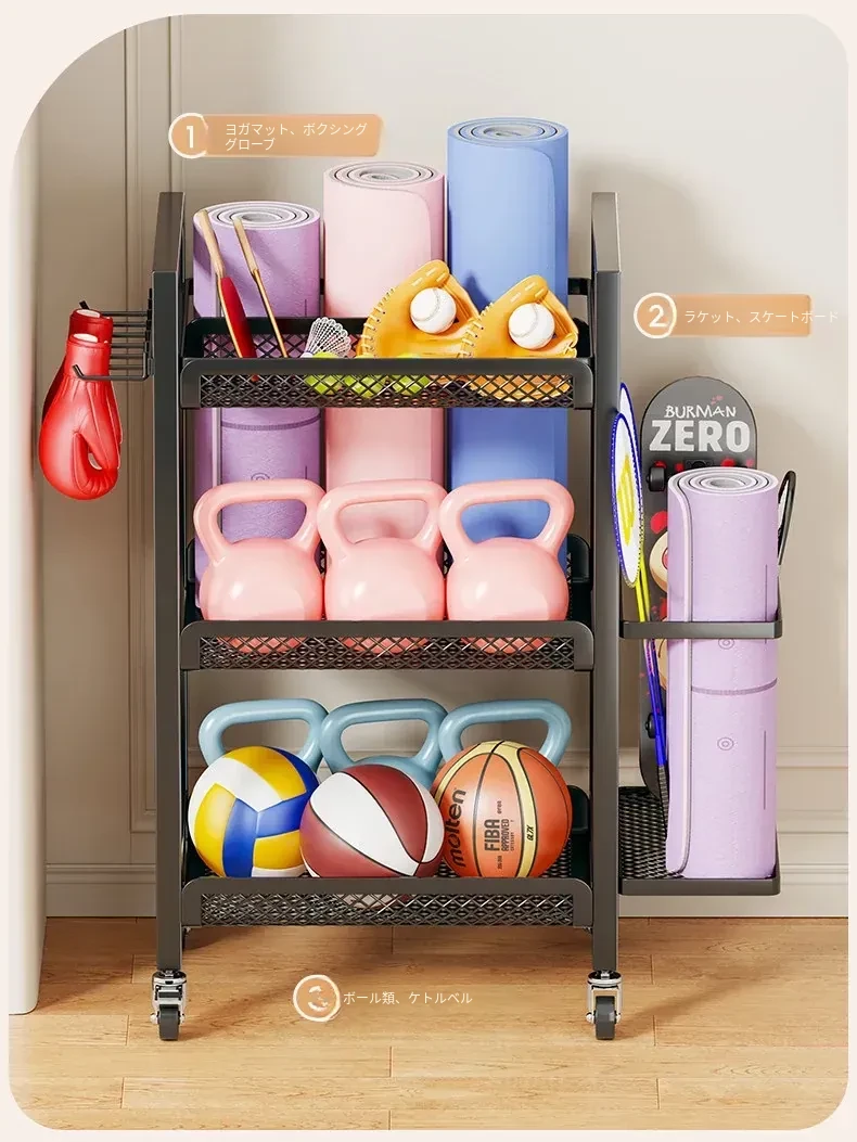 家庭用フィットネス収納ラック!ダンベルスタンド、ヨガマット、スポーツ道具収納バスケット、バドミントンラケット置き場で、すっきり整理整頓!あなたのトレーニングスペースをもっと快適に!