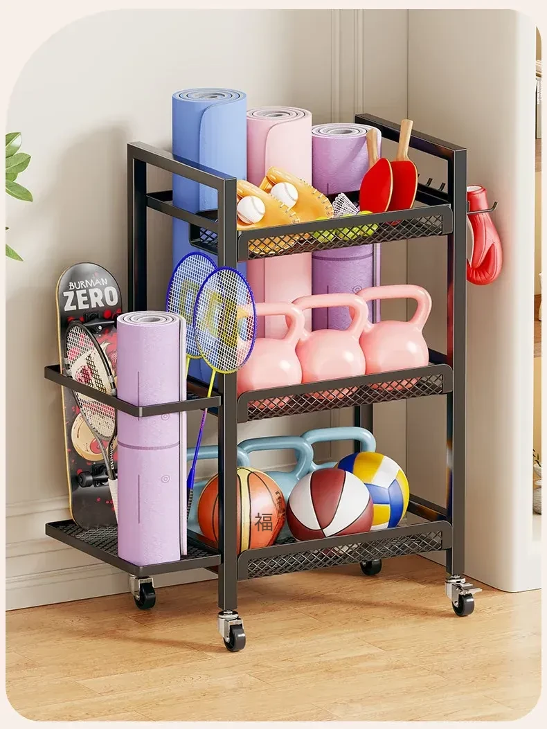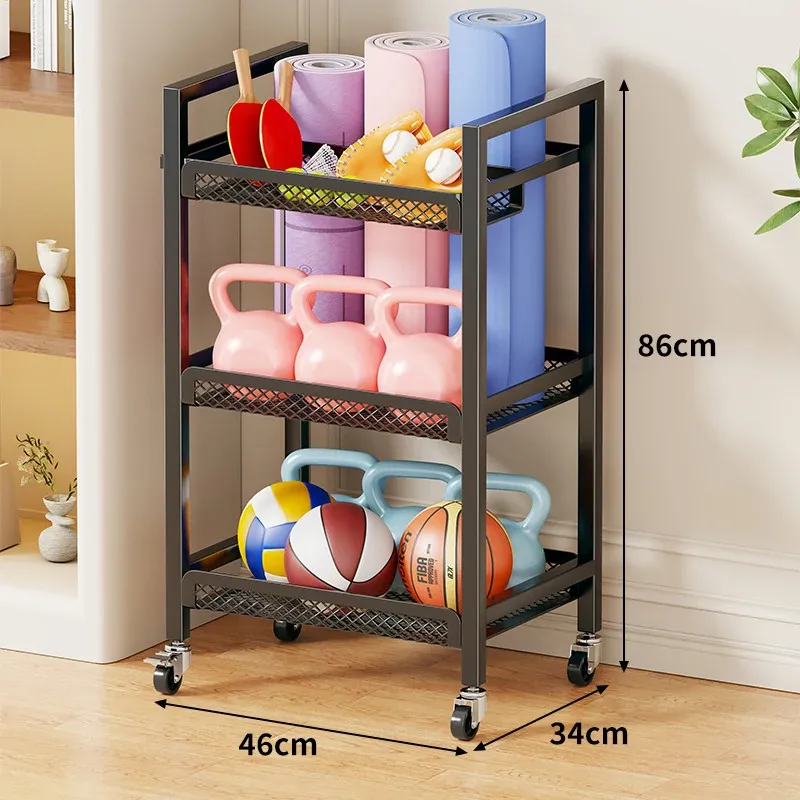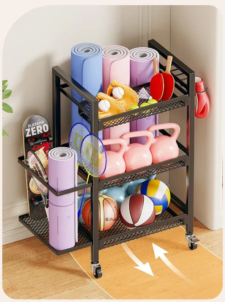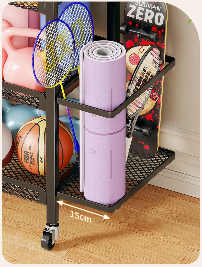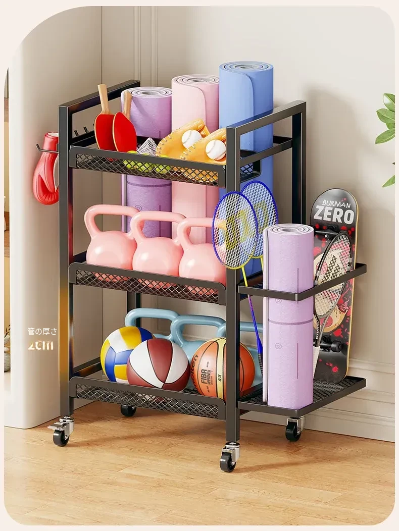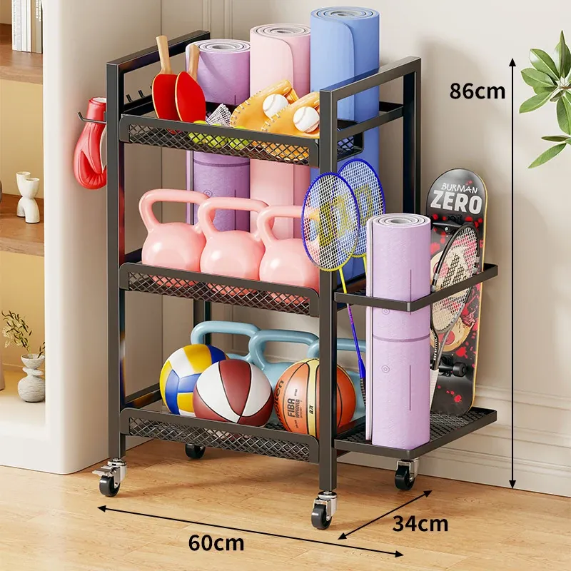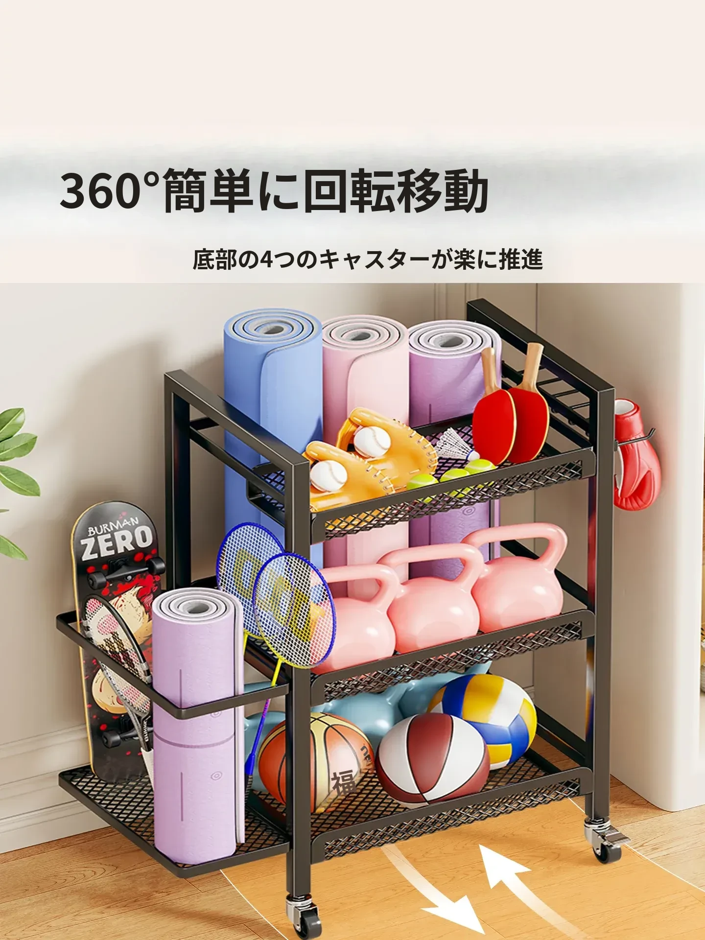 家庭用フィットネス収納ラック!ダンベルスタンド、ヨガマット、スポーツ道具収納バスケット、バドミントンラケット置き場で、すっきり整理整頓!あなたのトレーニングスペースをもっと快適に!