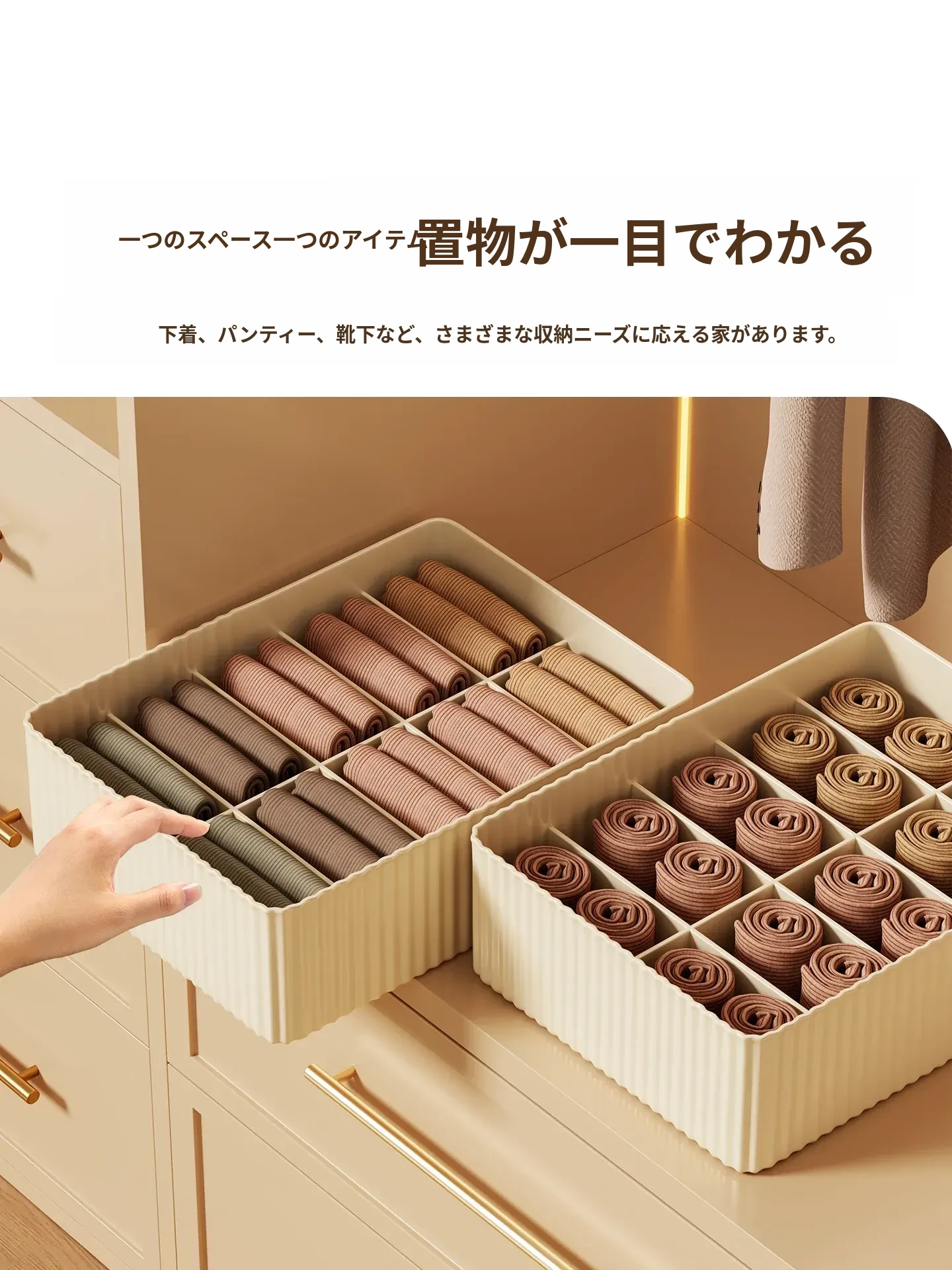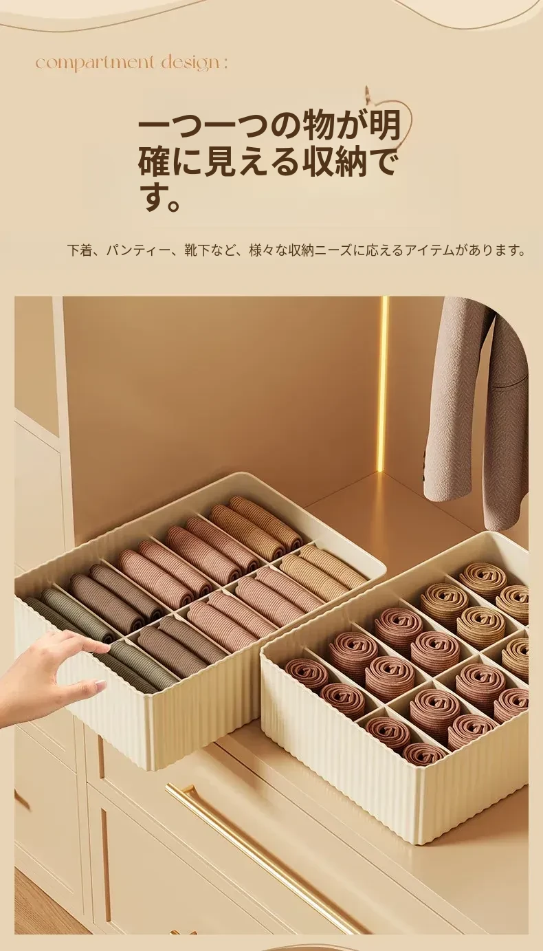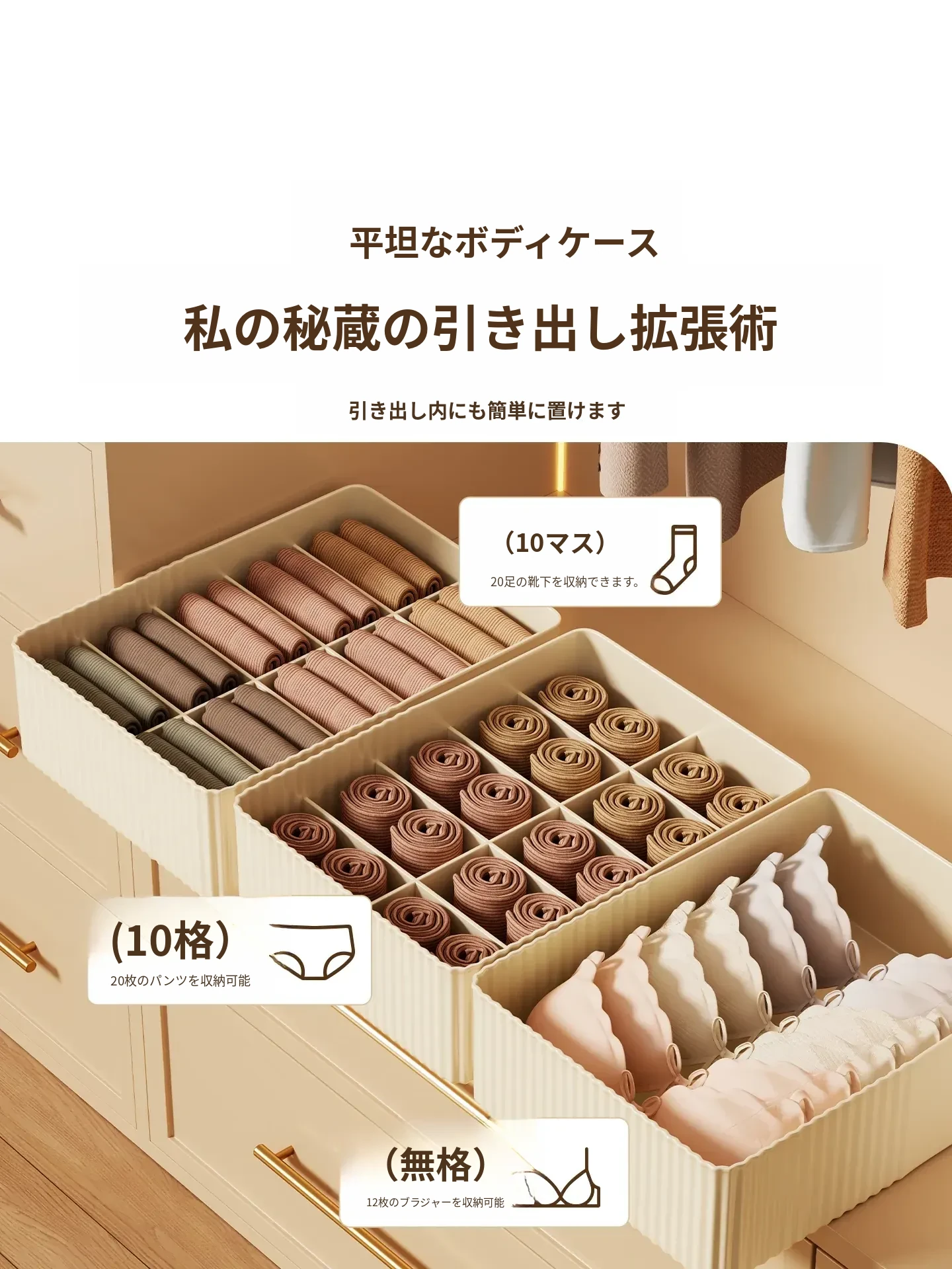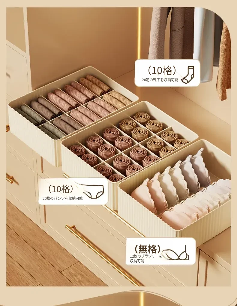 大容量内衣収納ボックス!衣類を整理整頓するための仕切り付き、ソックスやパンティー、ブラジャーをすっきり収納。クローゼットを美しく保ち、探しやすくする整理整頓アイテム!