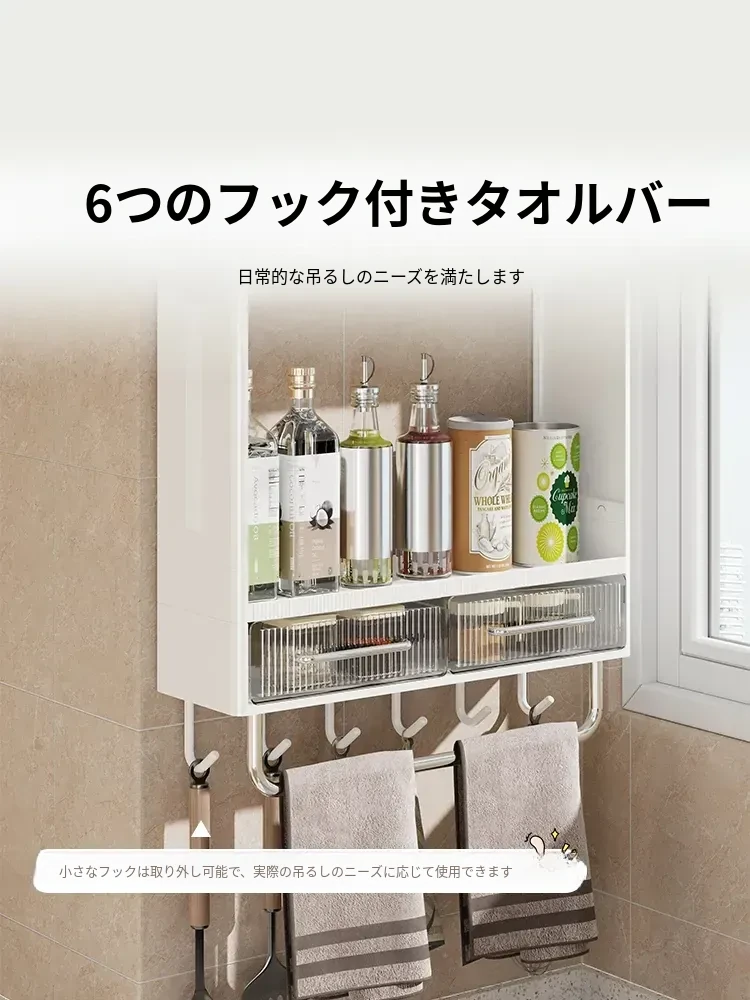 【ハイタイプ】2段引き出し付き+6個フック+タオルバー付き