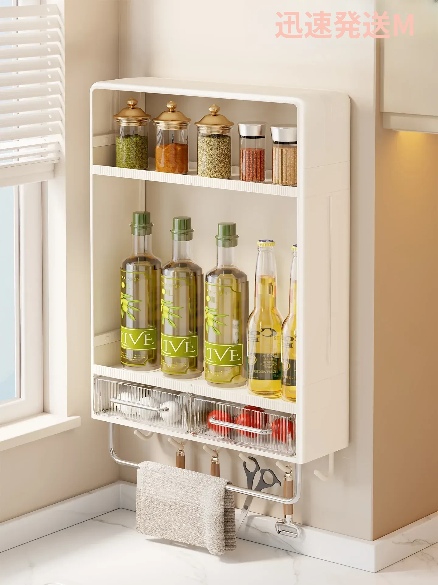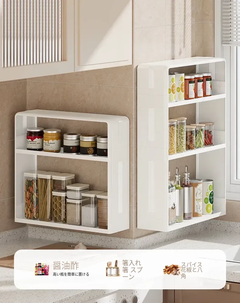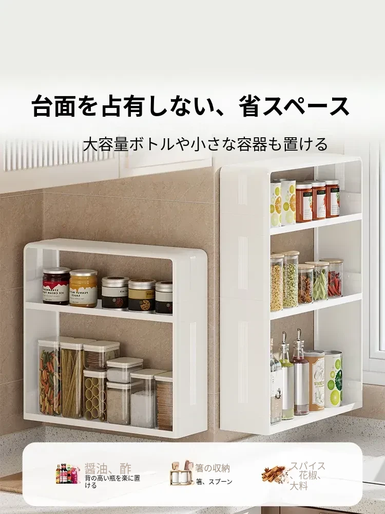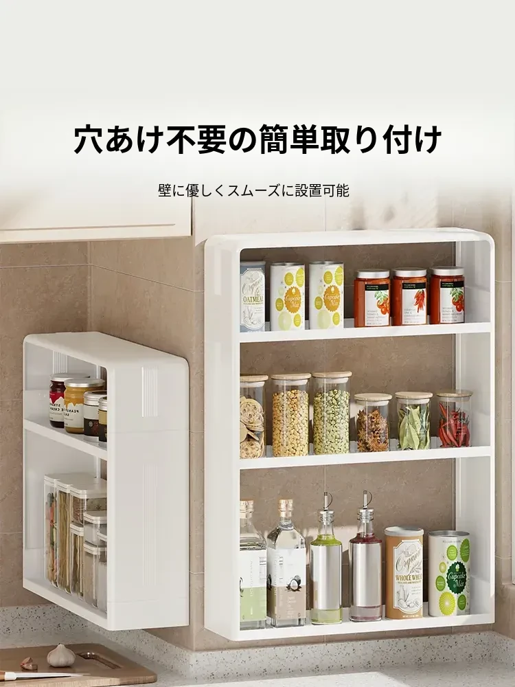 壁掛け多機能キッチン収納ラック - 調味料、油、塩、醤油、酢をスマートに整理!穴あけ不要で簡単取り付け、スッキリとしたキッチン空間を実現します。