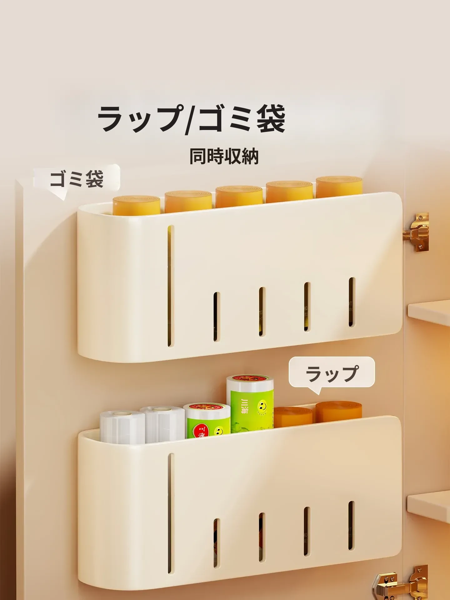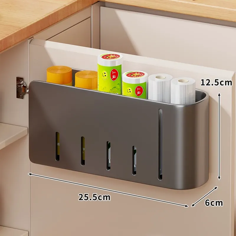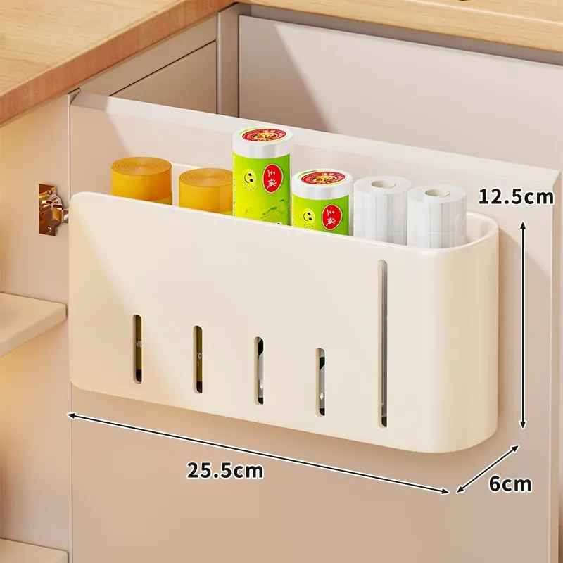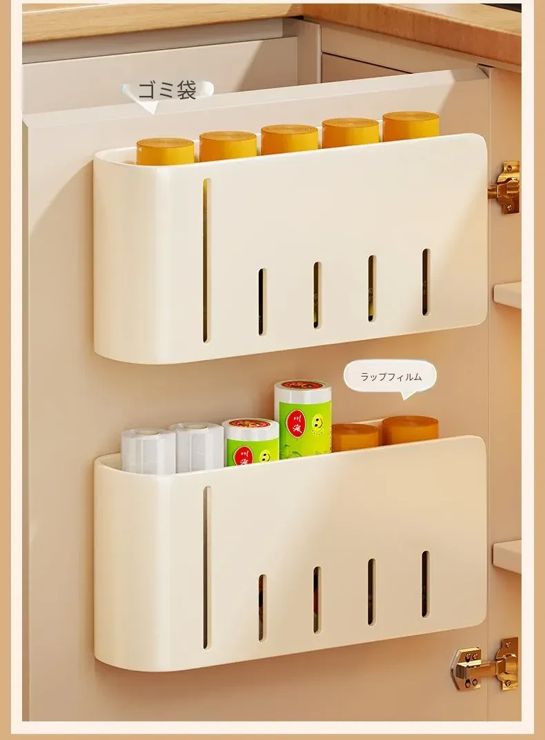 キッチン壁掛けゴミ袋収納ハンガー 〜 穴を開けずに簡単取り付け!キャビネットドア内側にぴったりフィットするプラスチック袋&ラップ収納ボックス