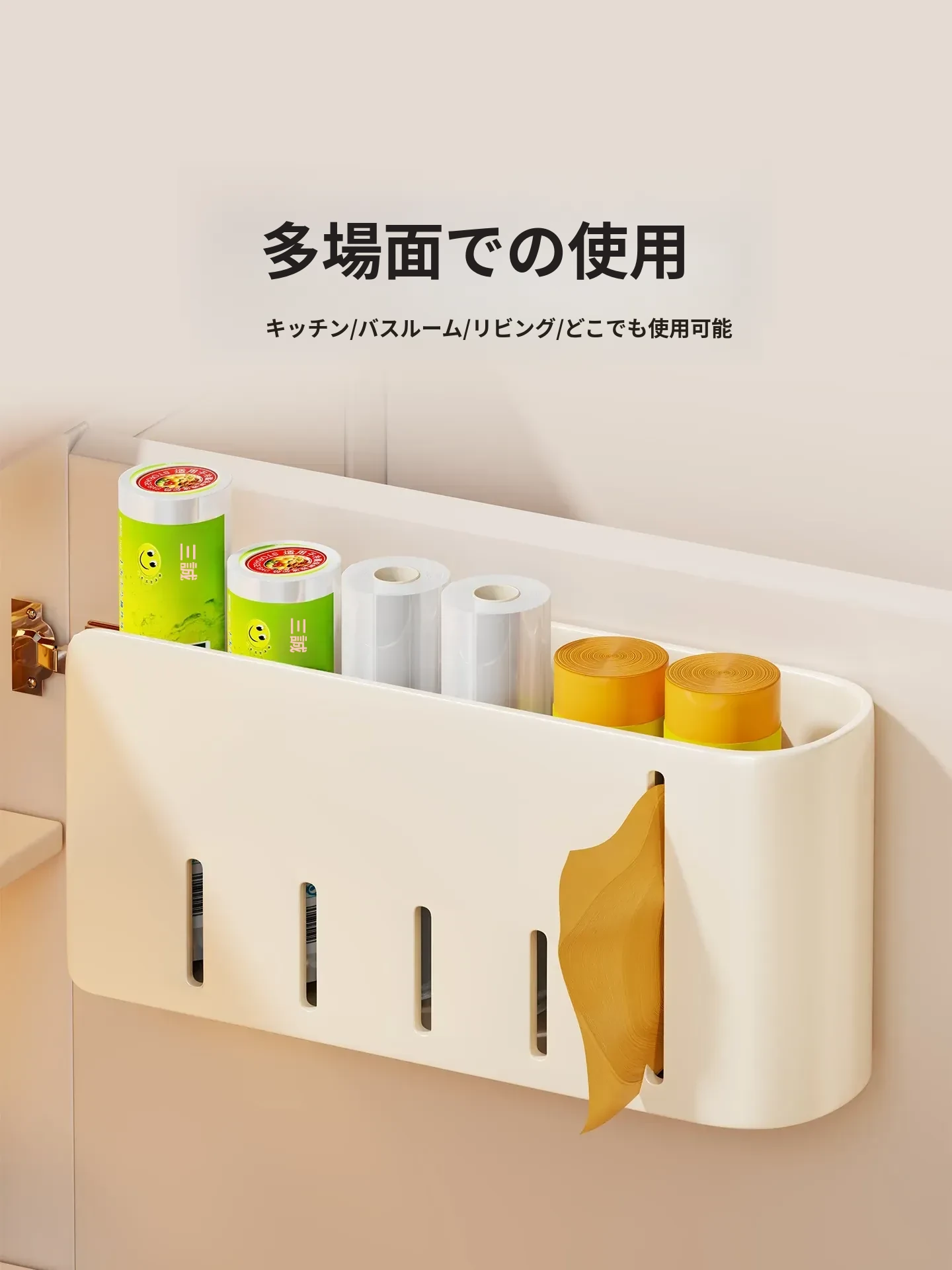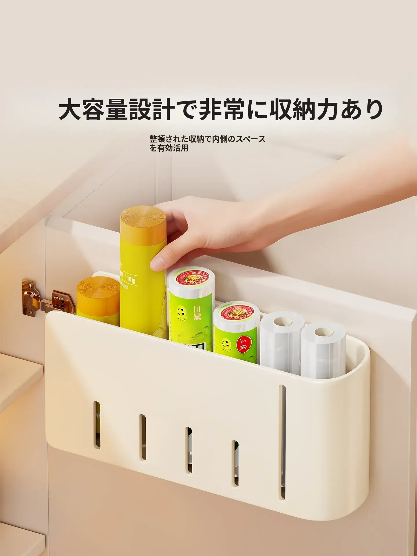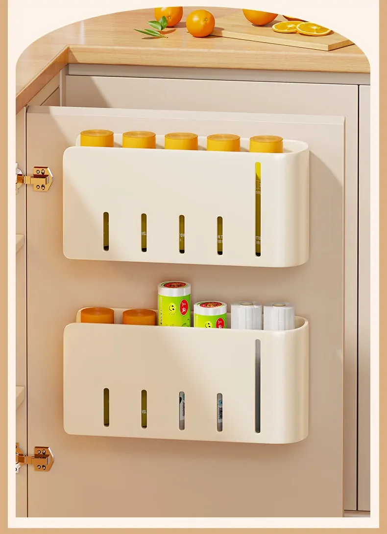 キッチン壁掛けゴミ袋収納ハンガー 〜 穴を開けずに簡単取り付け!キャビネットドア内側にぴったりフィットするプラスチック袋&ラップ収納ボックス