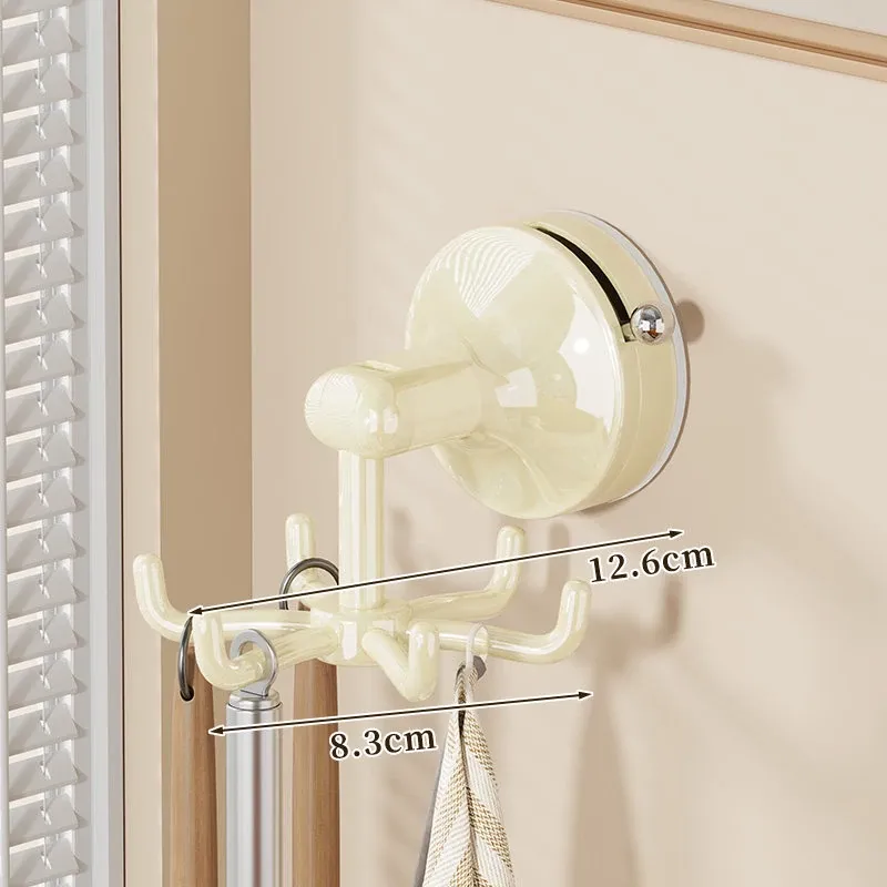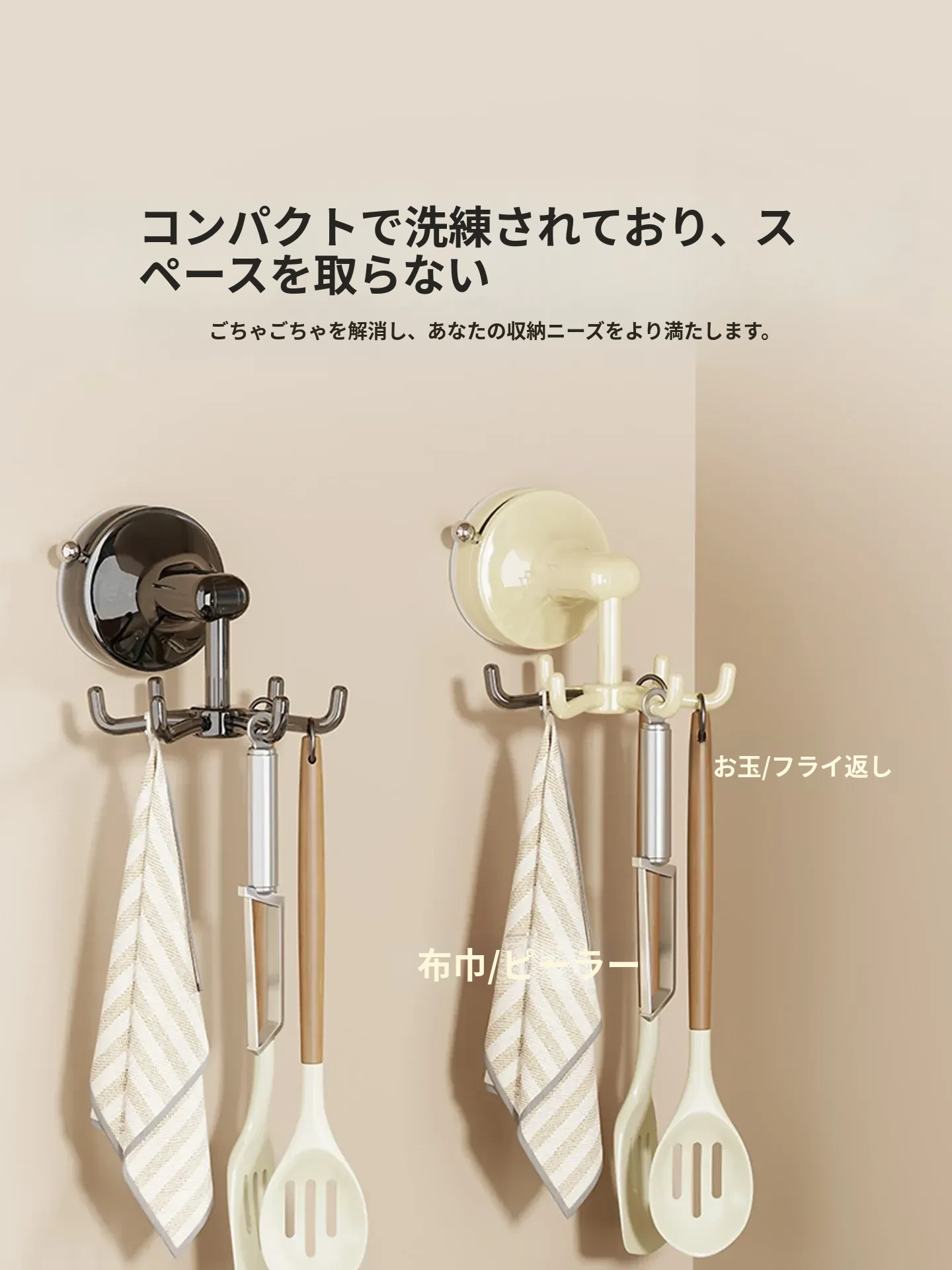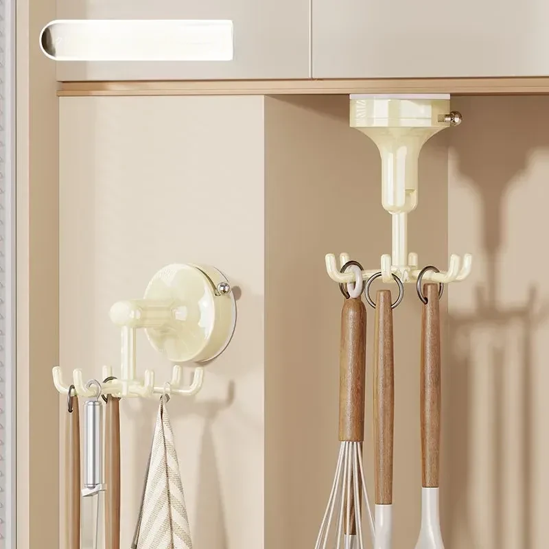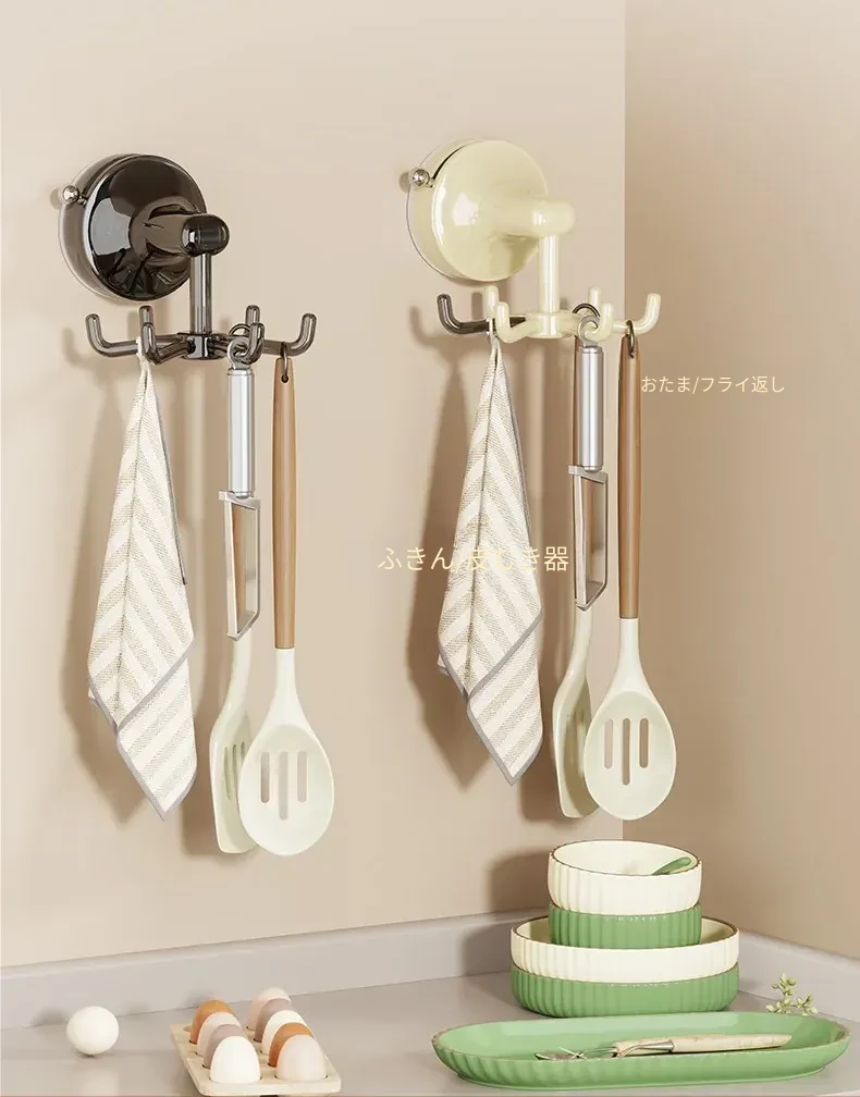 キッチン吸盤フック 壁掛け式 回転おたま・スプーン収納ラック 無痕・穴あけ不要の便利な調理器具収納棚!あなたのキッチンをスッキリ整理し、使いやすさをアップ!