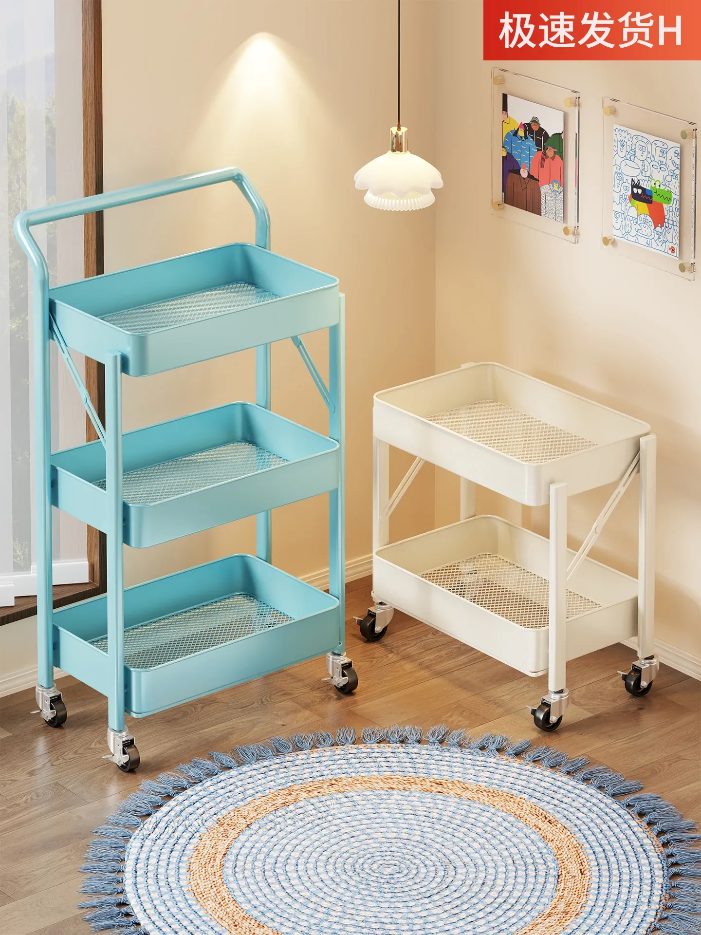 おしゃれなリビングに最適!折りたたみ可能な多段収納ラック、バッグやお菓子をスッキリ整理。移動も簡単な小型カートで、お部屋をスマートに演出します。