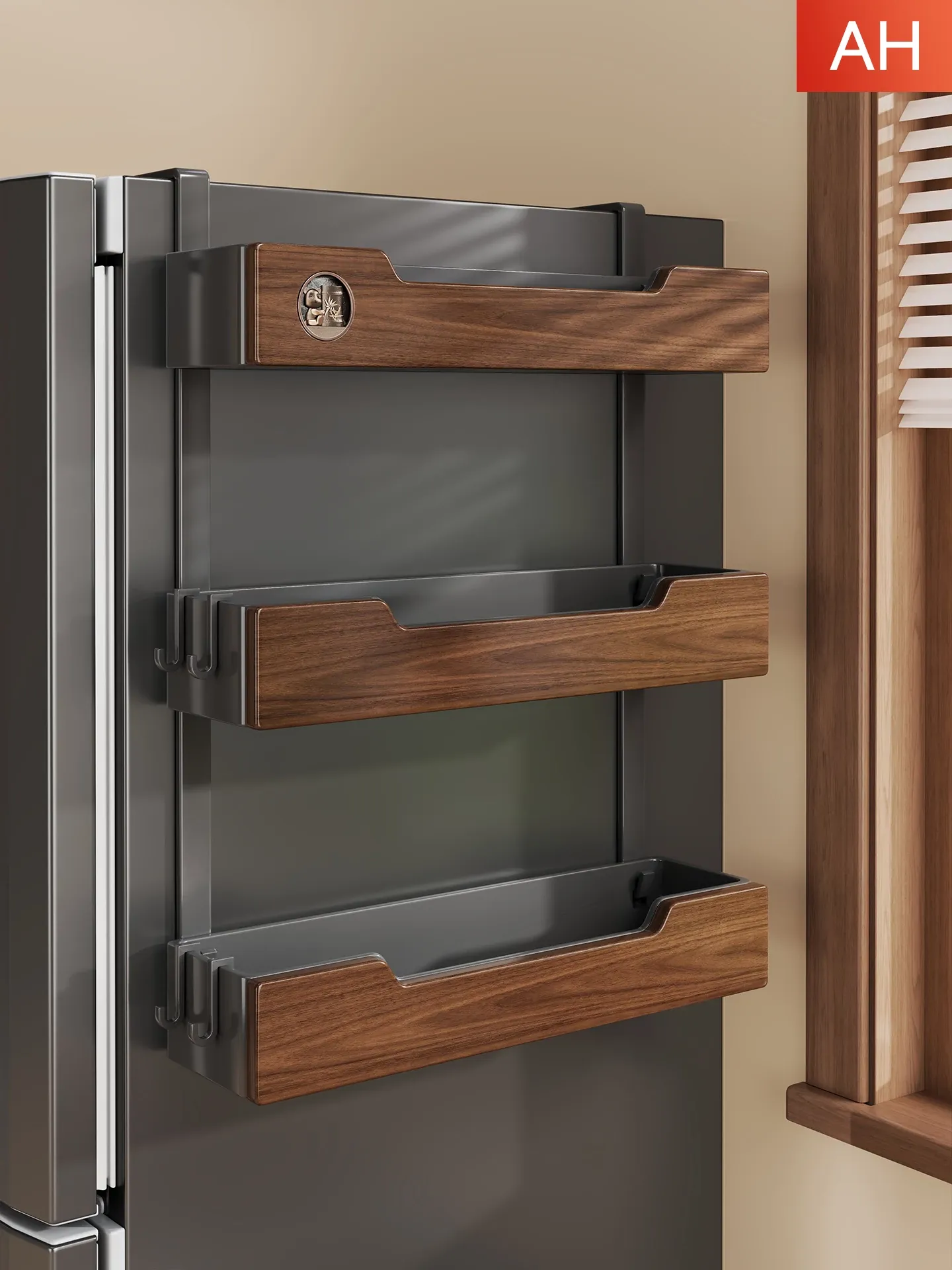 天然木材製の冷蔵庫サイド収納ラック|キッチン壁掛け|穴あけ不要|多段階スパイスラック|整理整頓の必需品!おしゃれで便利な収納ソリューション!